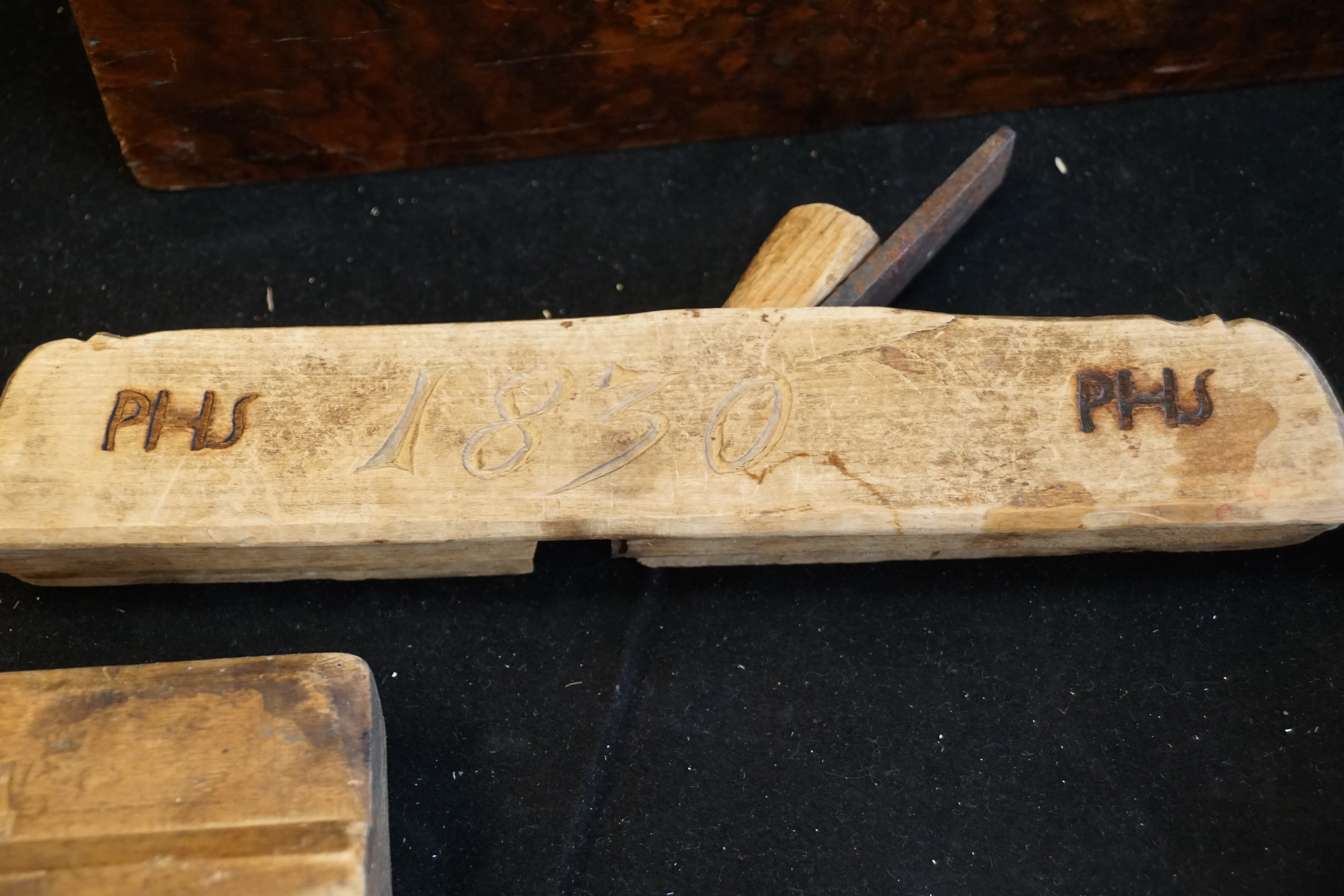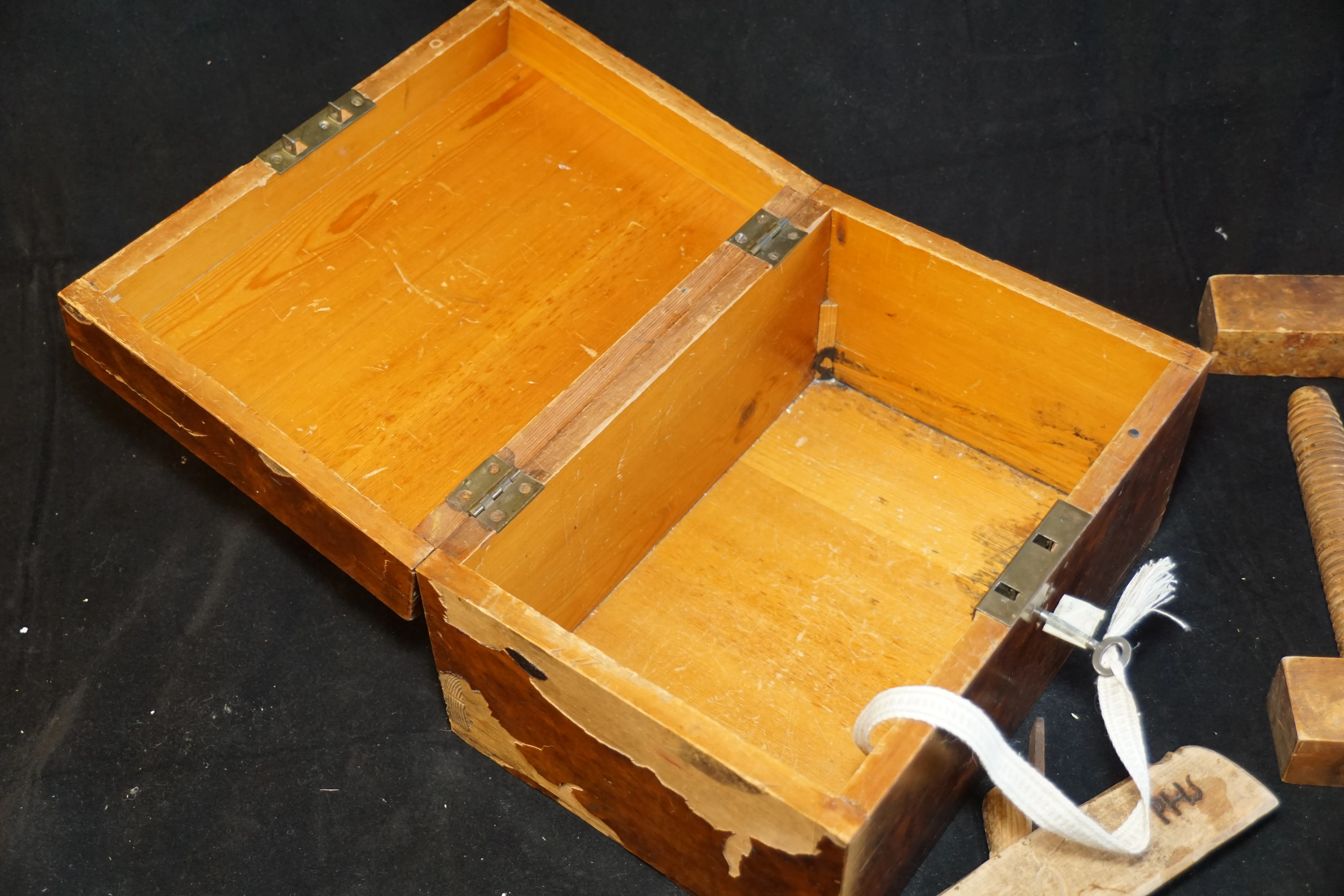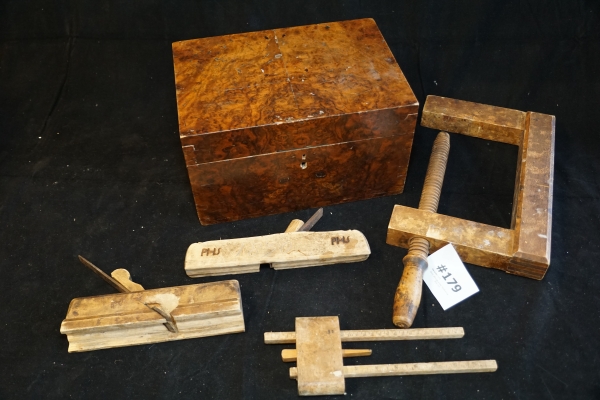 115. Äldre allmoge prylar hyvel tving låda mm