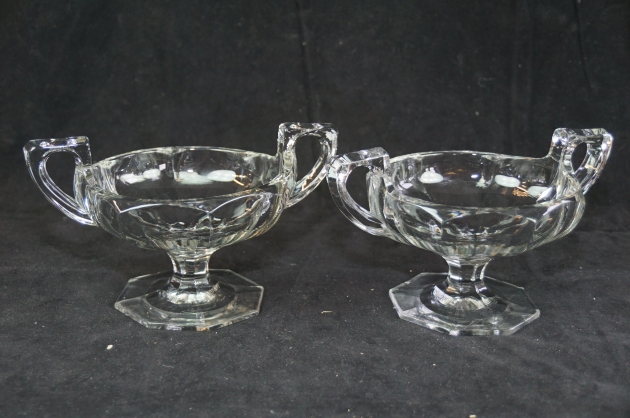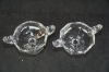 208. 2 godisskålar i glas Skål på fot med hänklar Pressglas