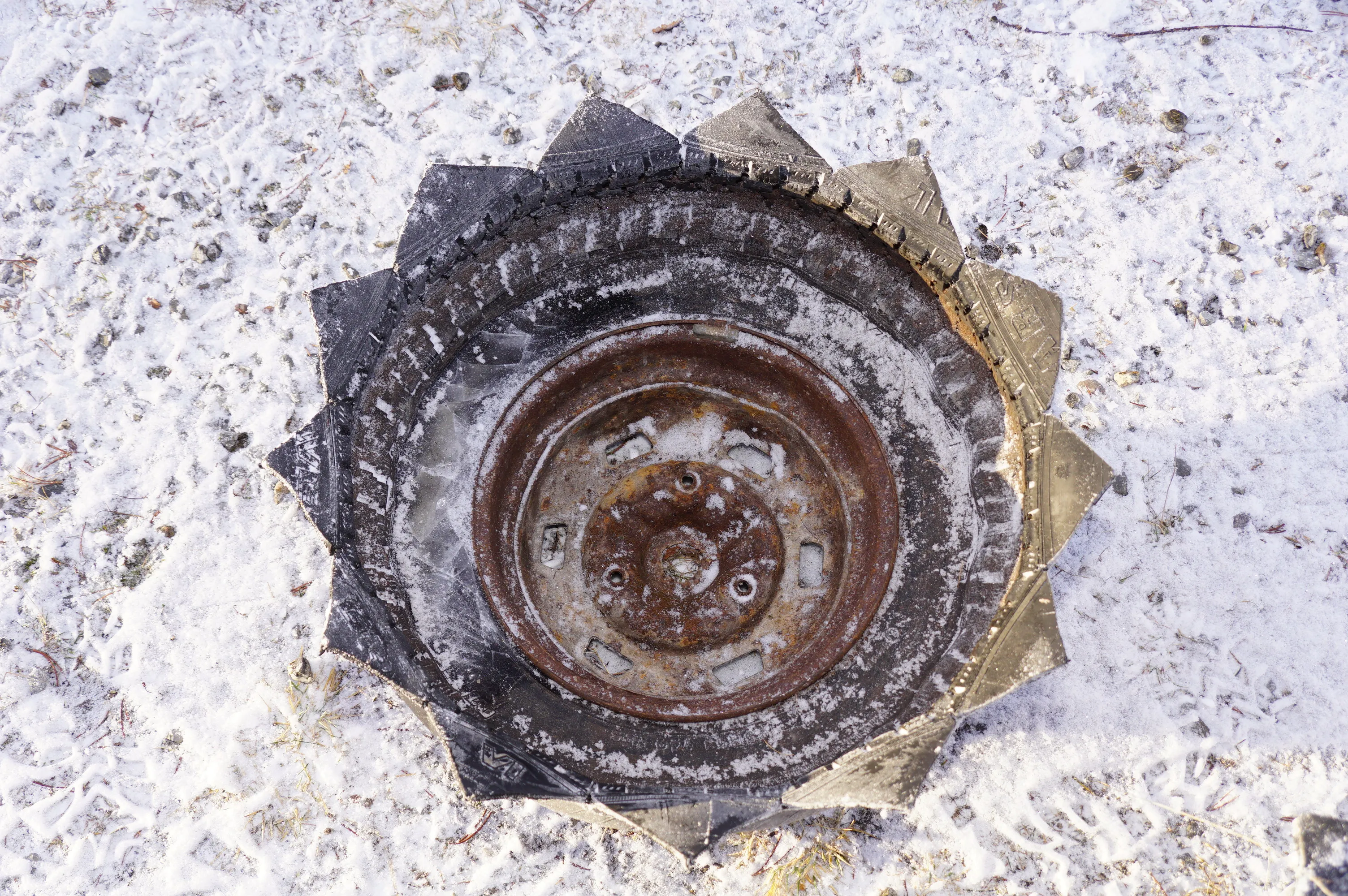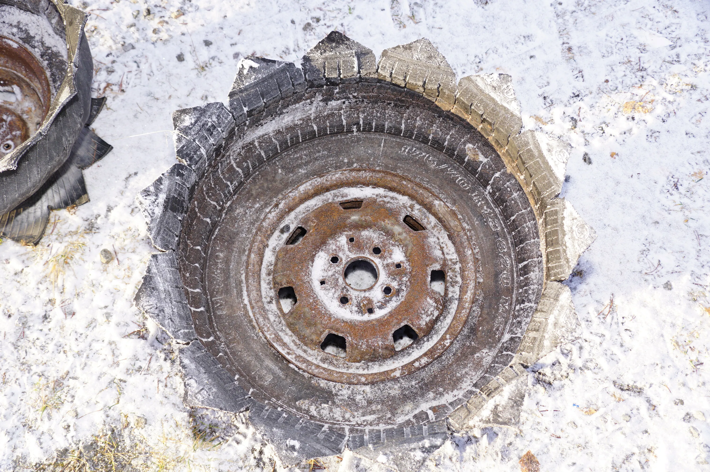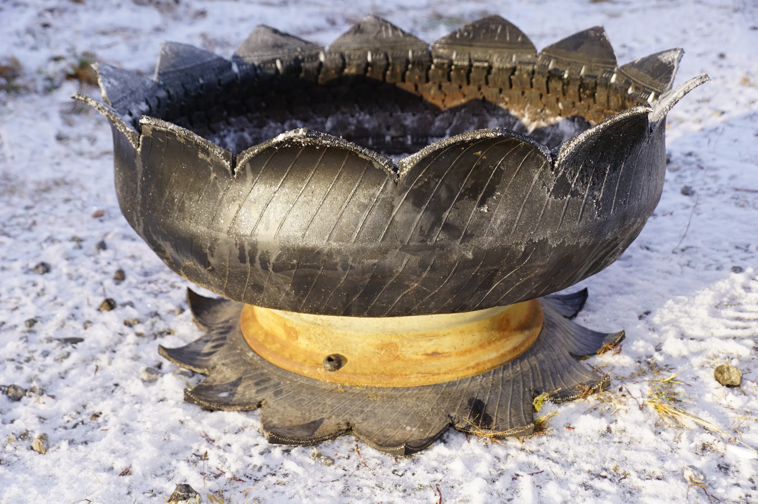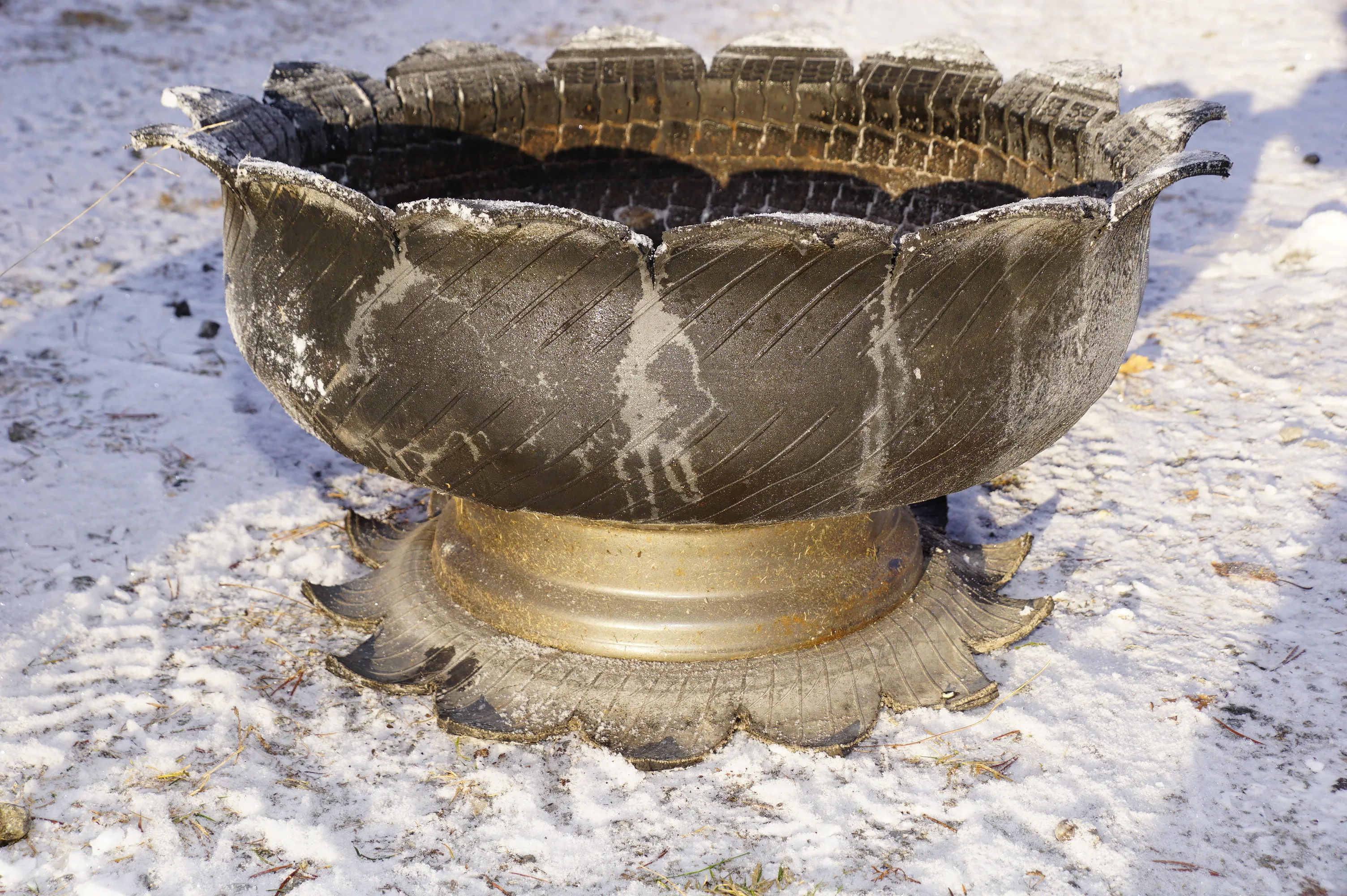 61. 2 större ute blomkrukor gjorda av bildäck och fälg