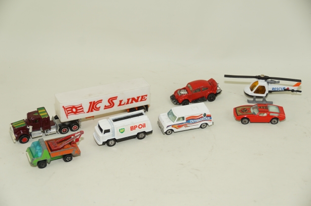 189. 6 småbilar och en helicopter leksaker