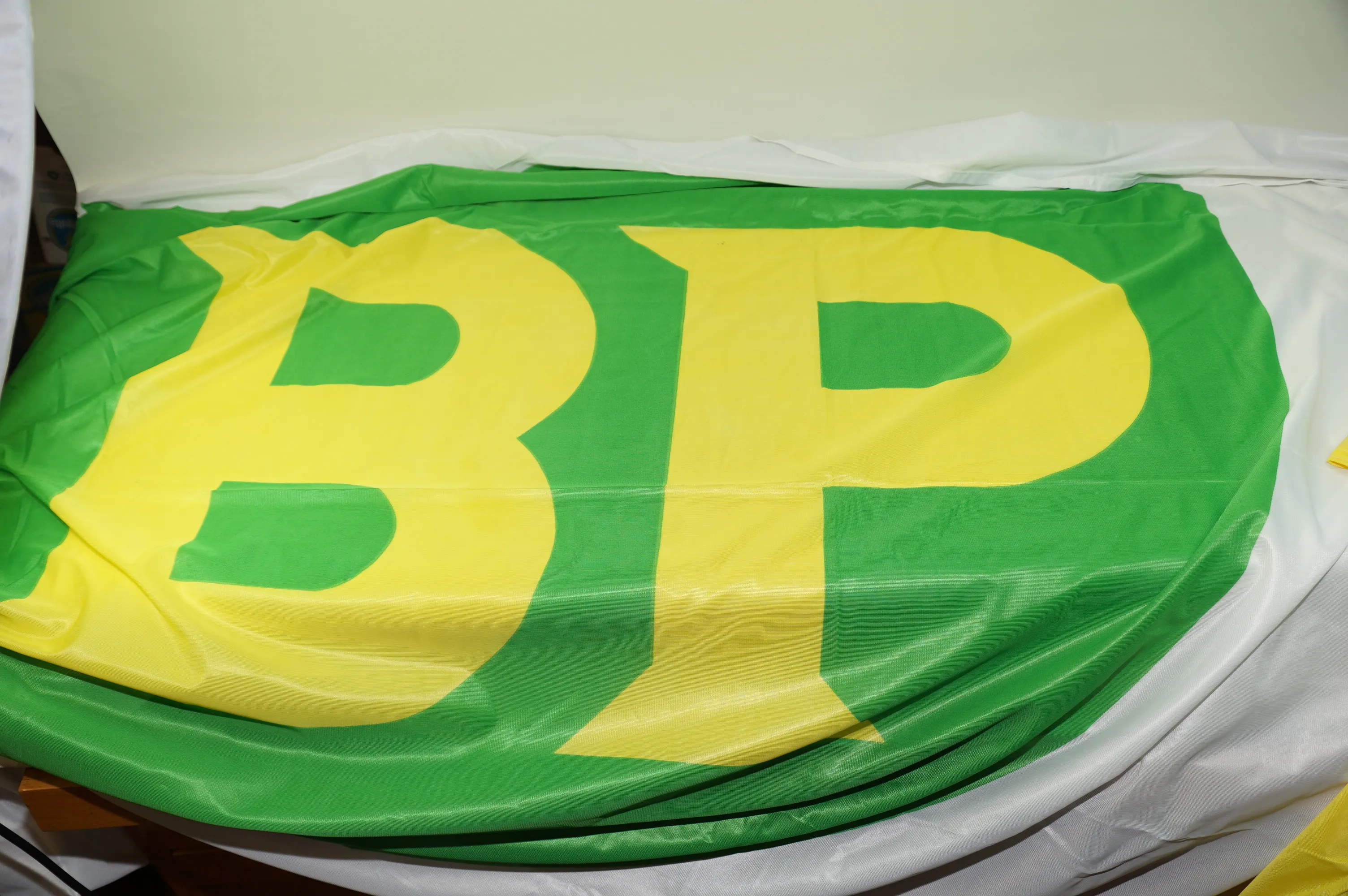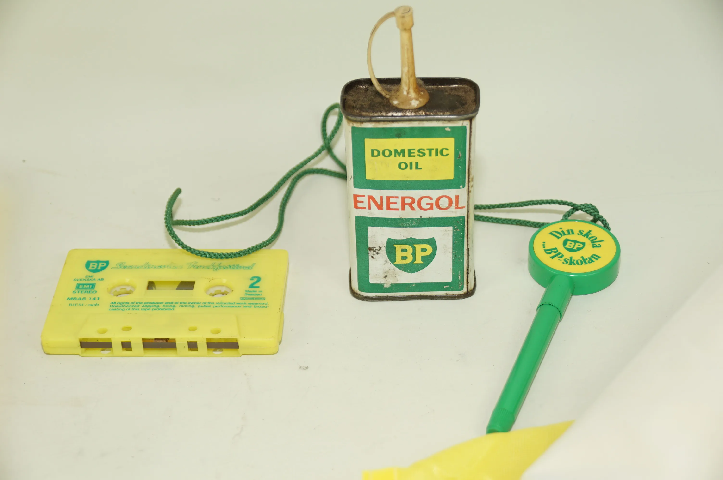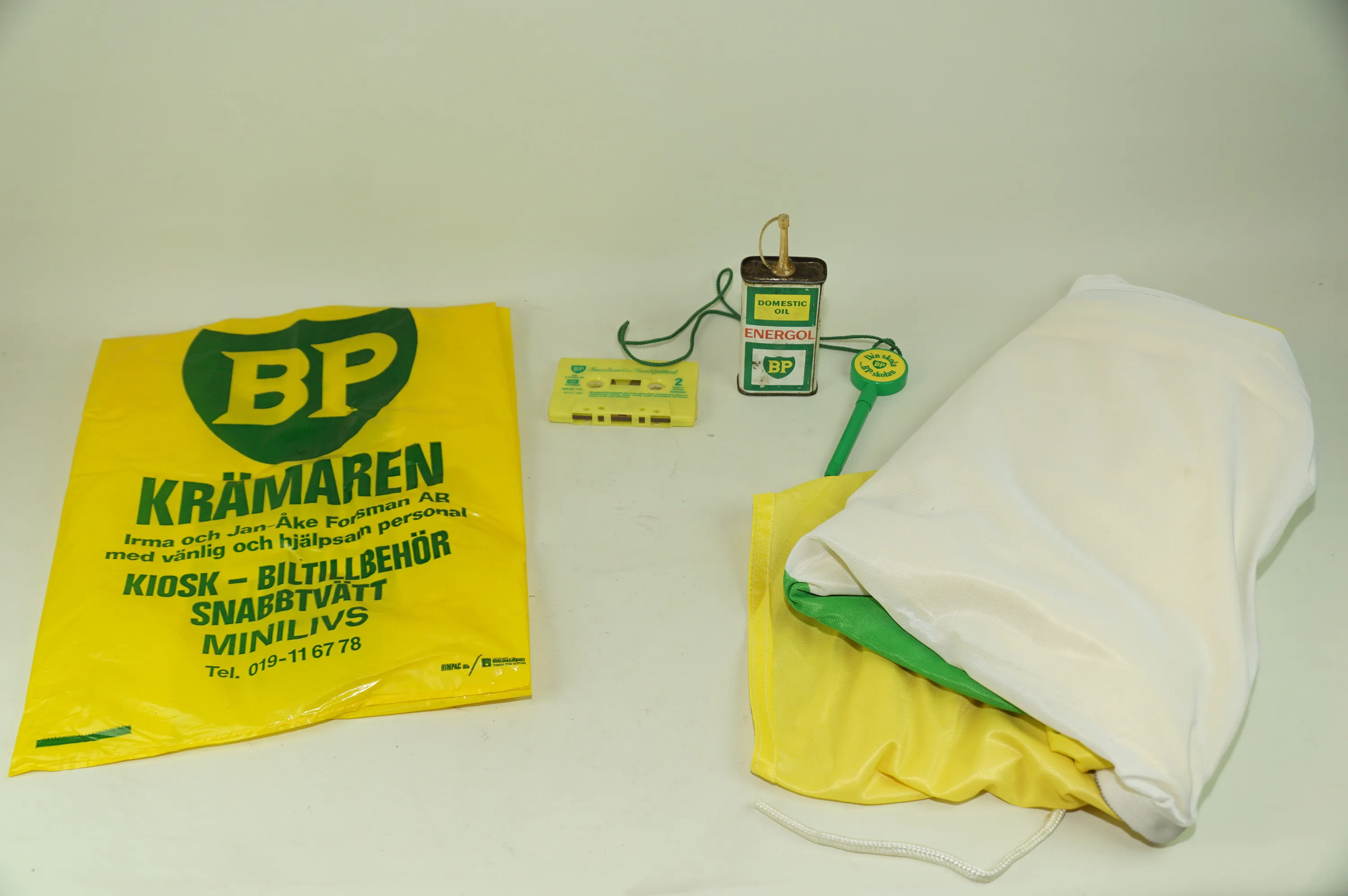 4. BP-flagga, Penna, oljeburk, kassettband och plastpåse.