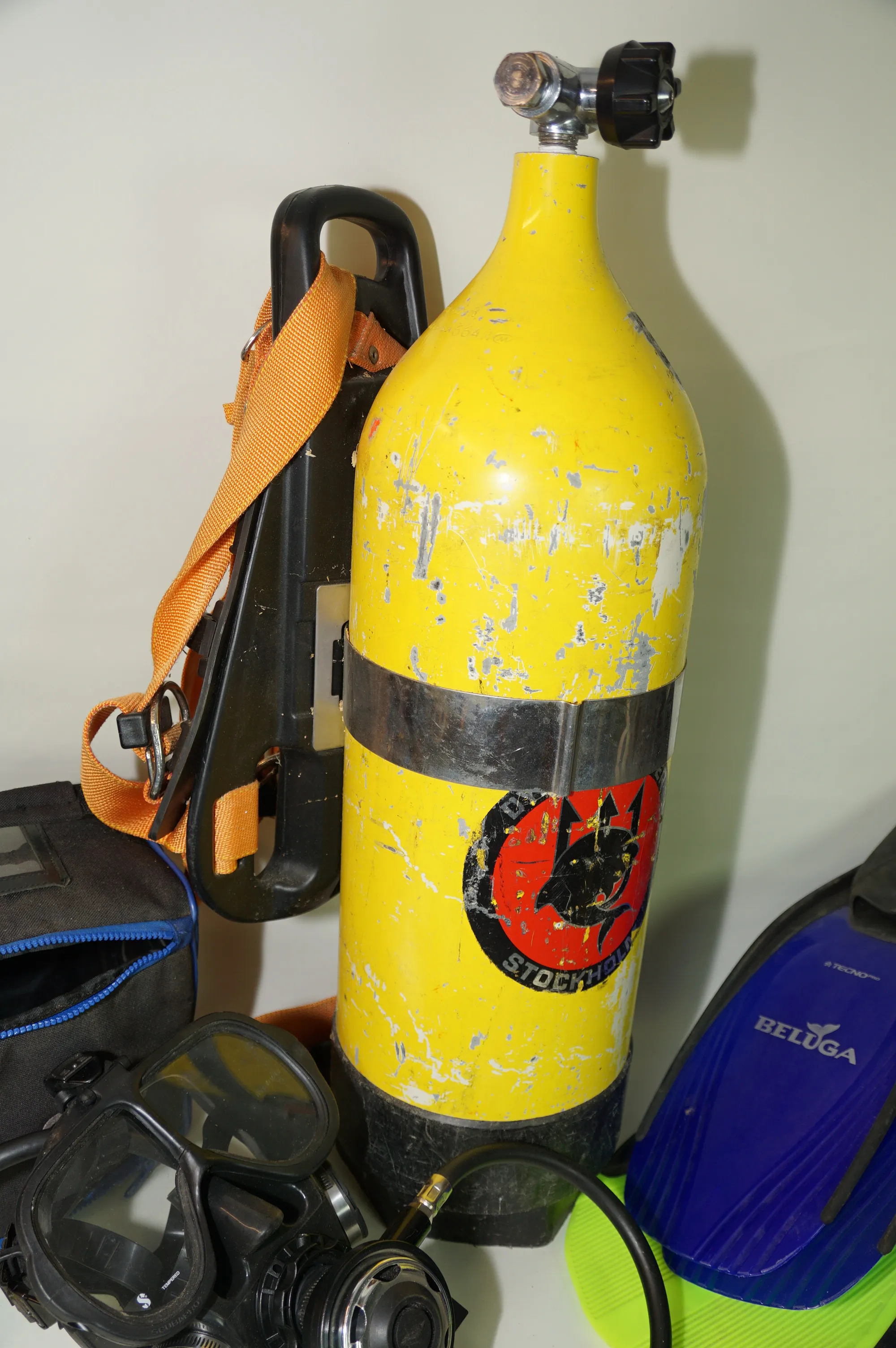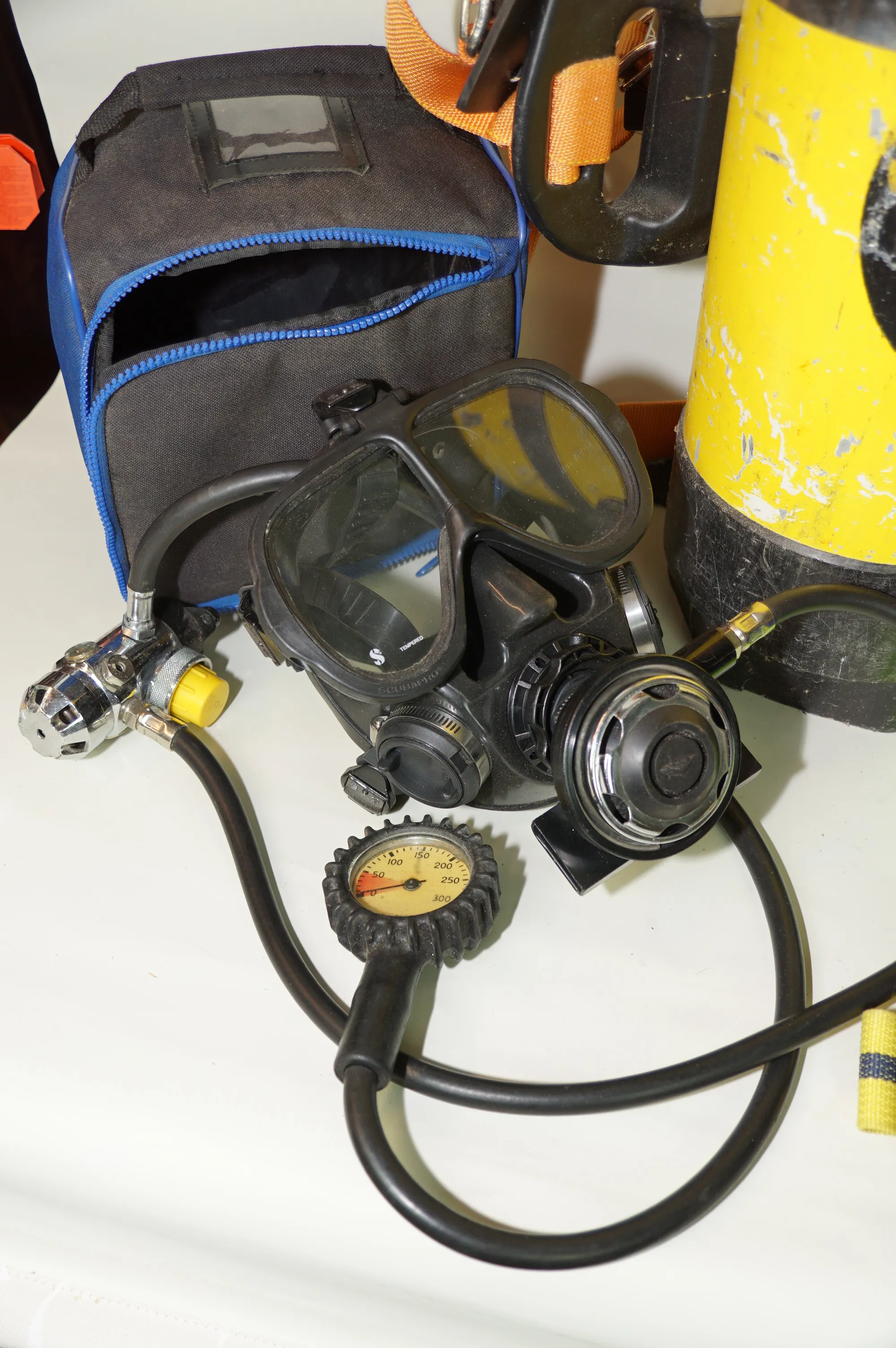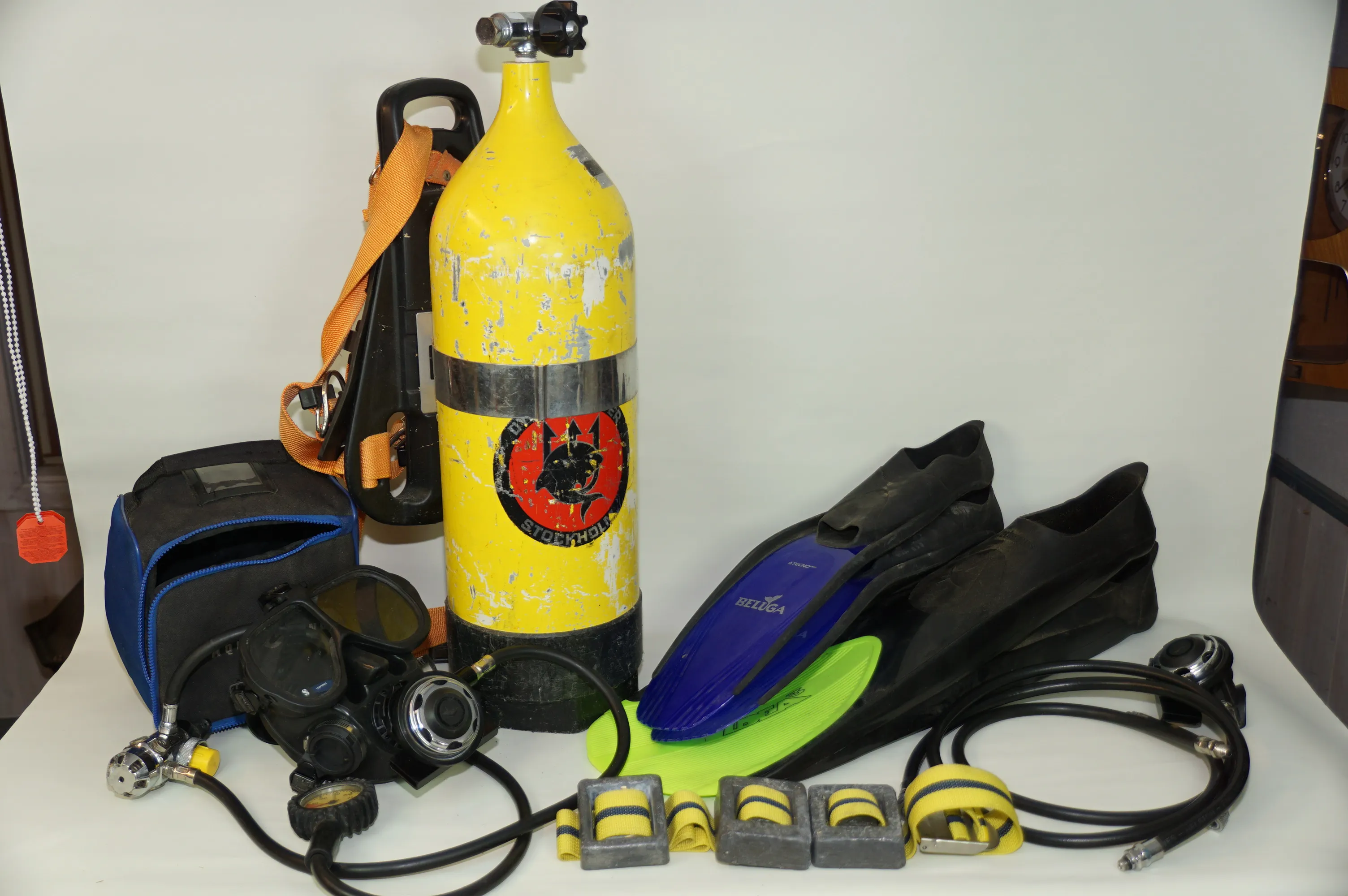 323. Dykning Tub regulator med mask blybälte simfötter Extra munstycke slangar