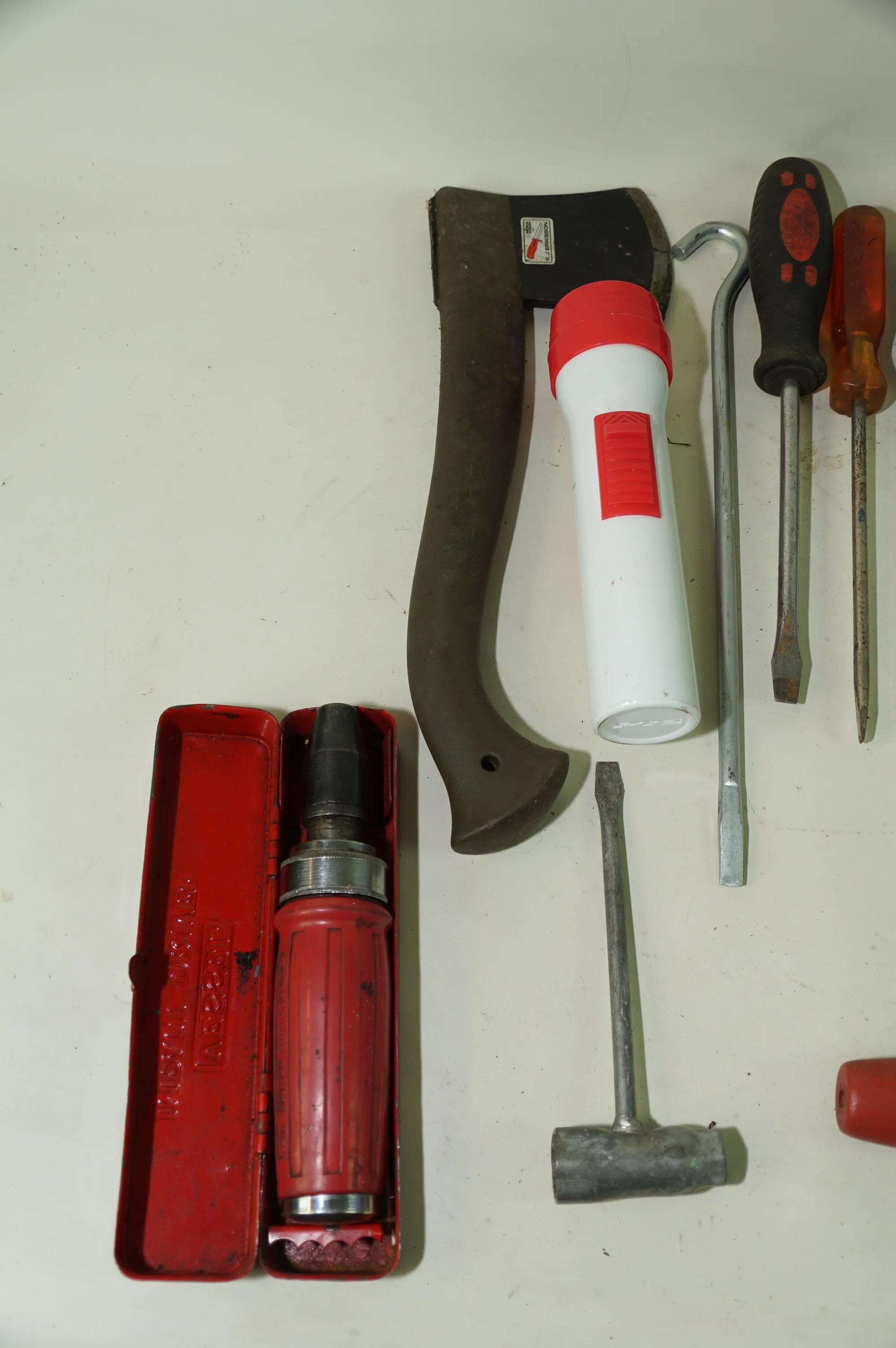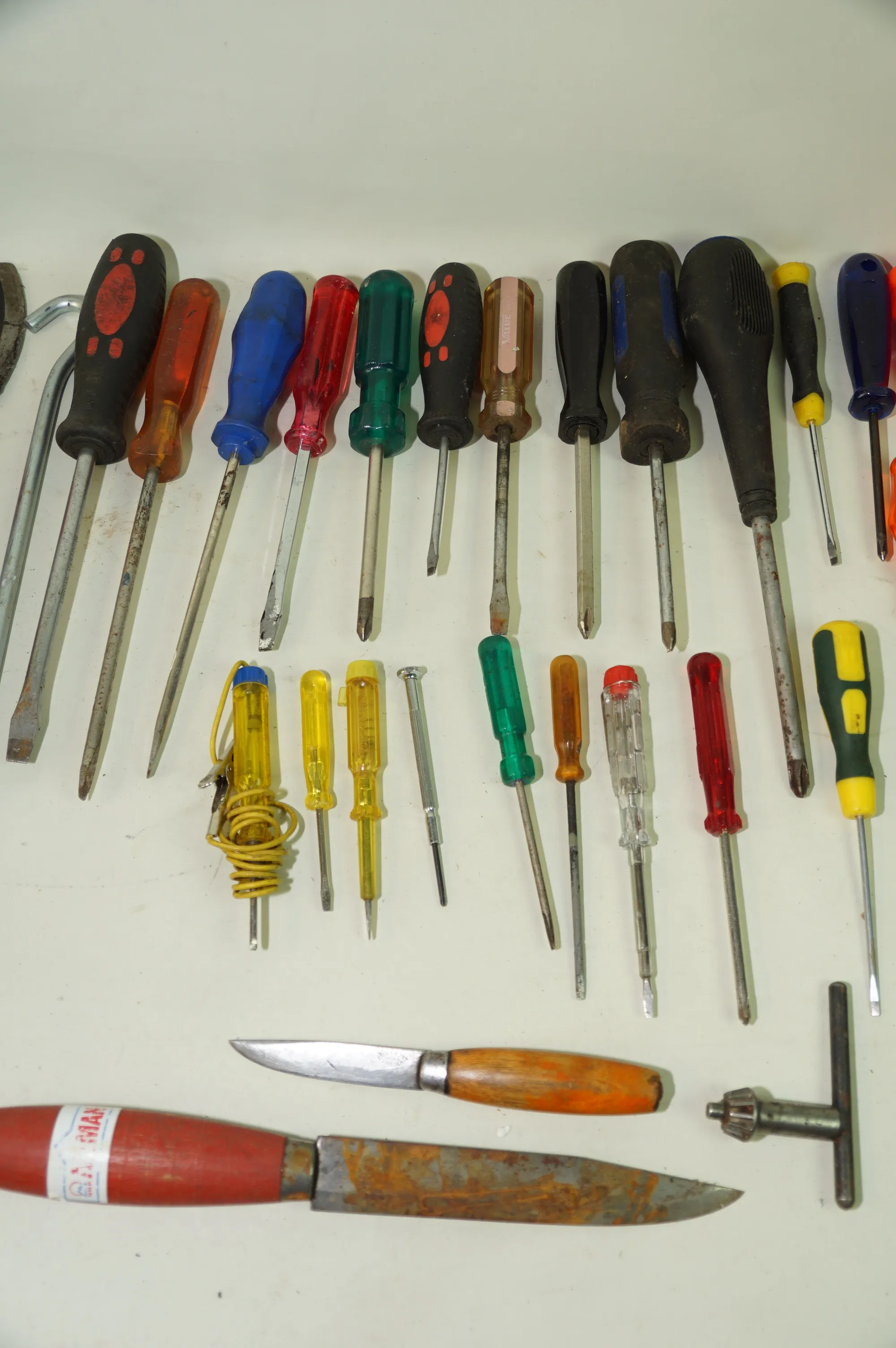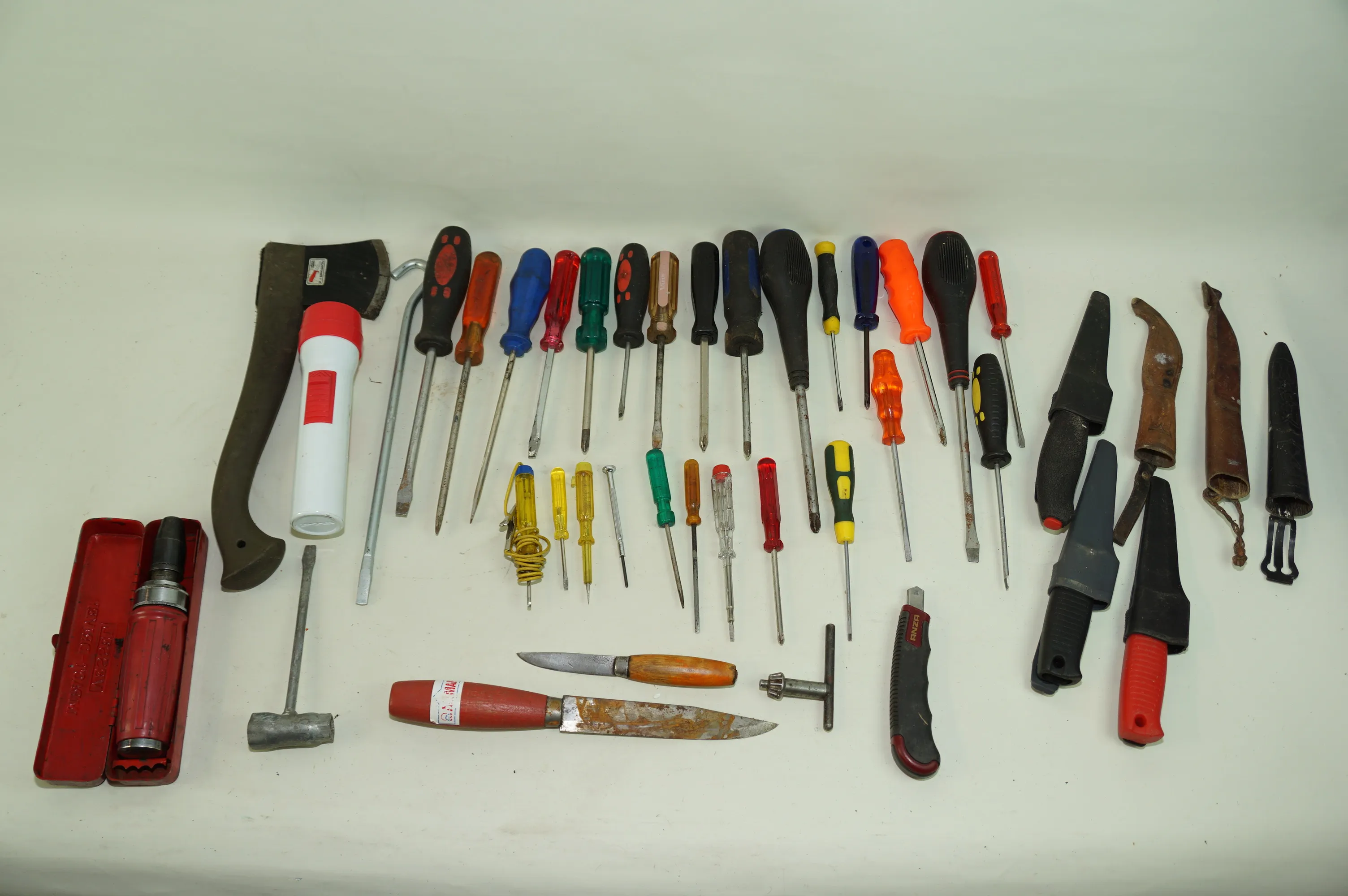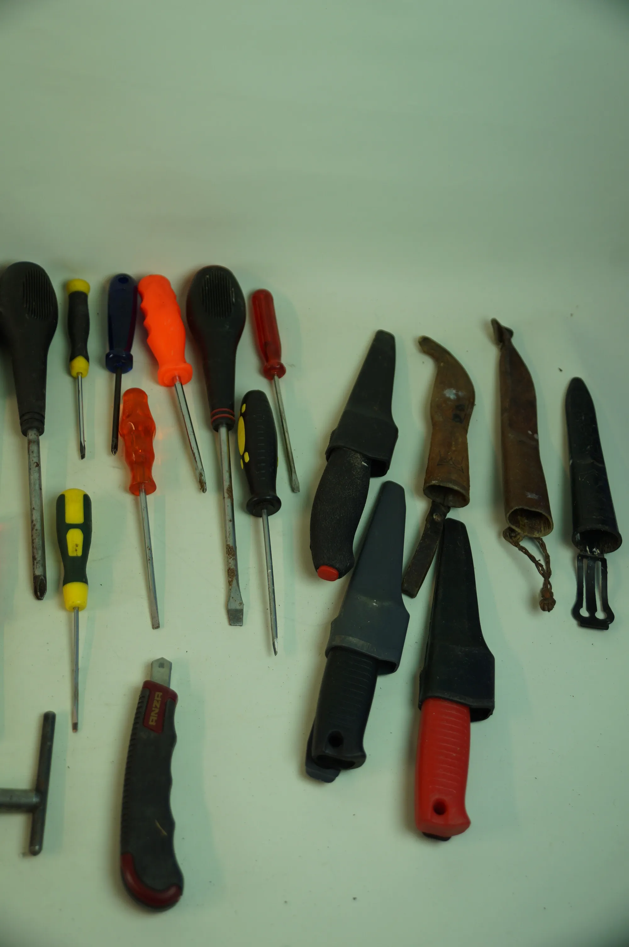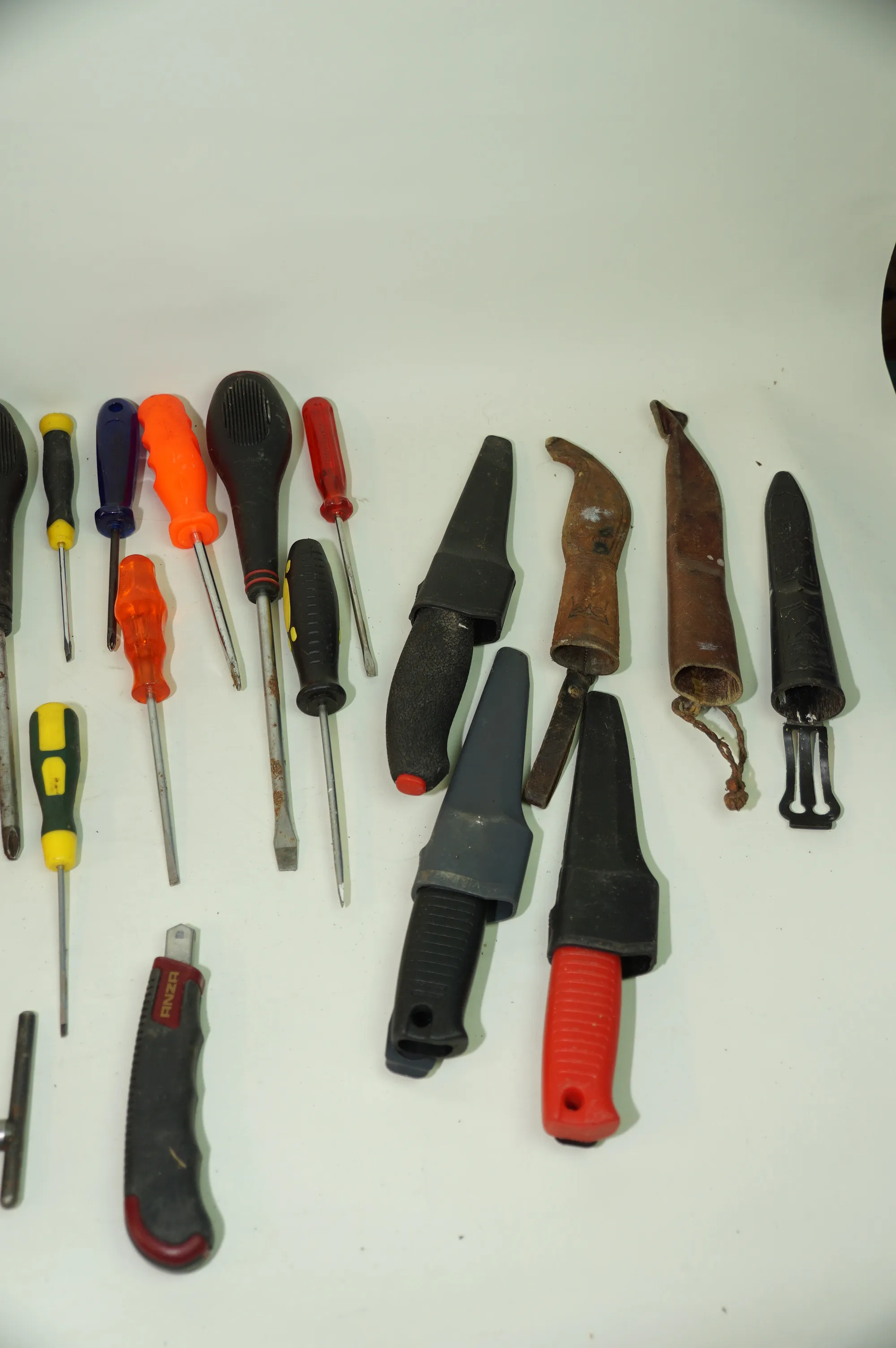 165. Fyndlåda blandade verktyg skruvmejslar knivar slidor