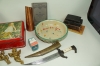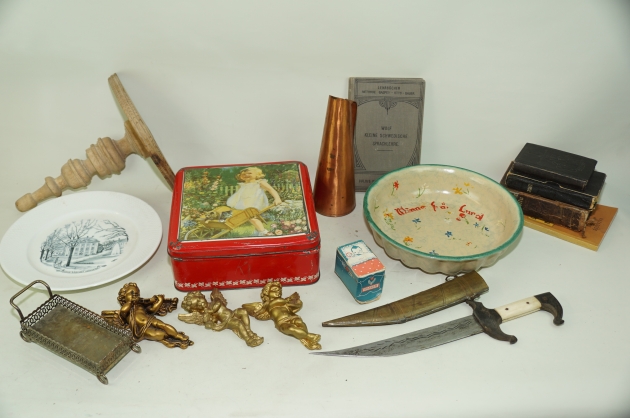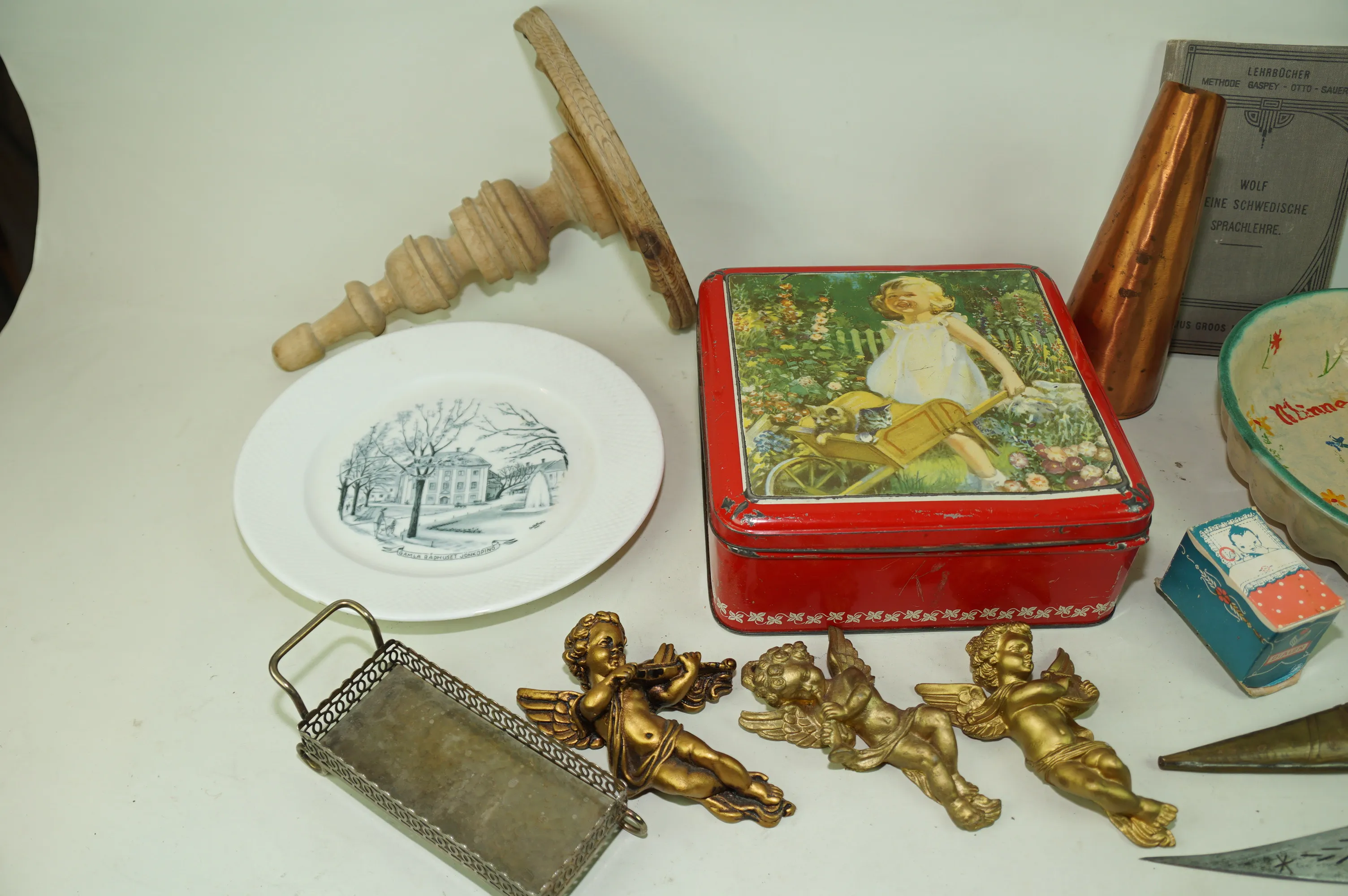249. Fyndlåda med blandade antika prylar plåtburk biblar porslin mm