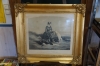 292. Gammalt tryck med stor guldförgylld ram. Kvinna med hund.