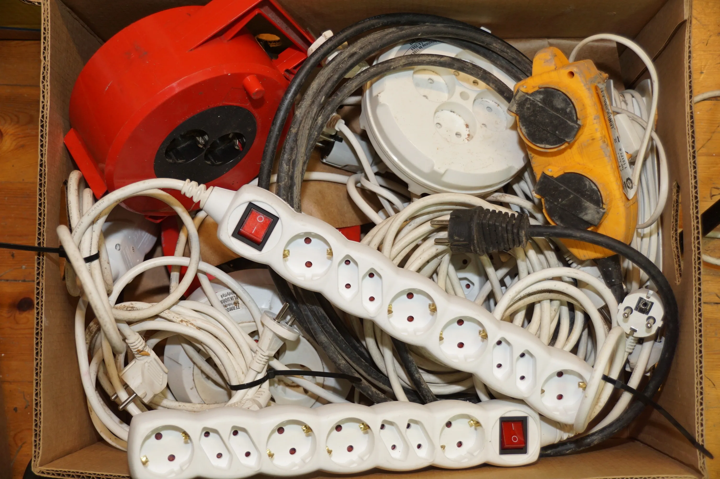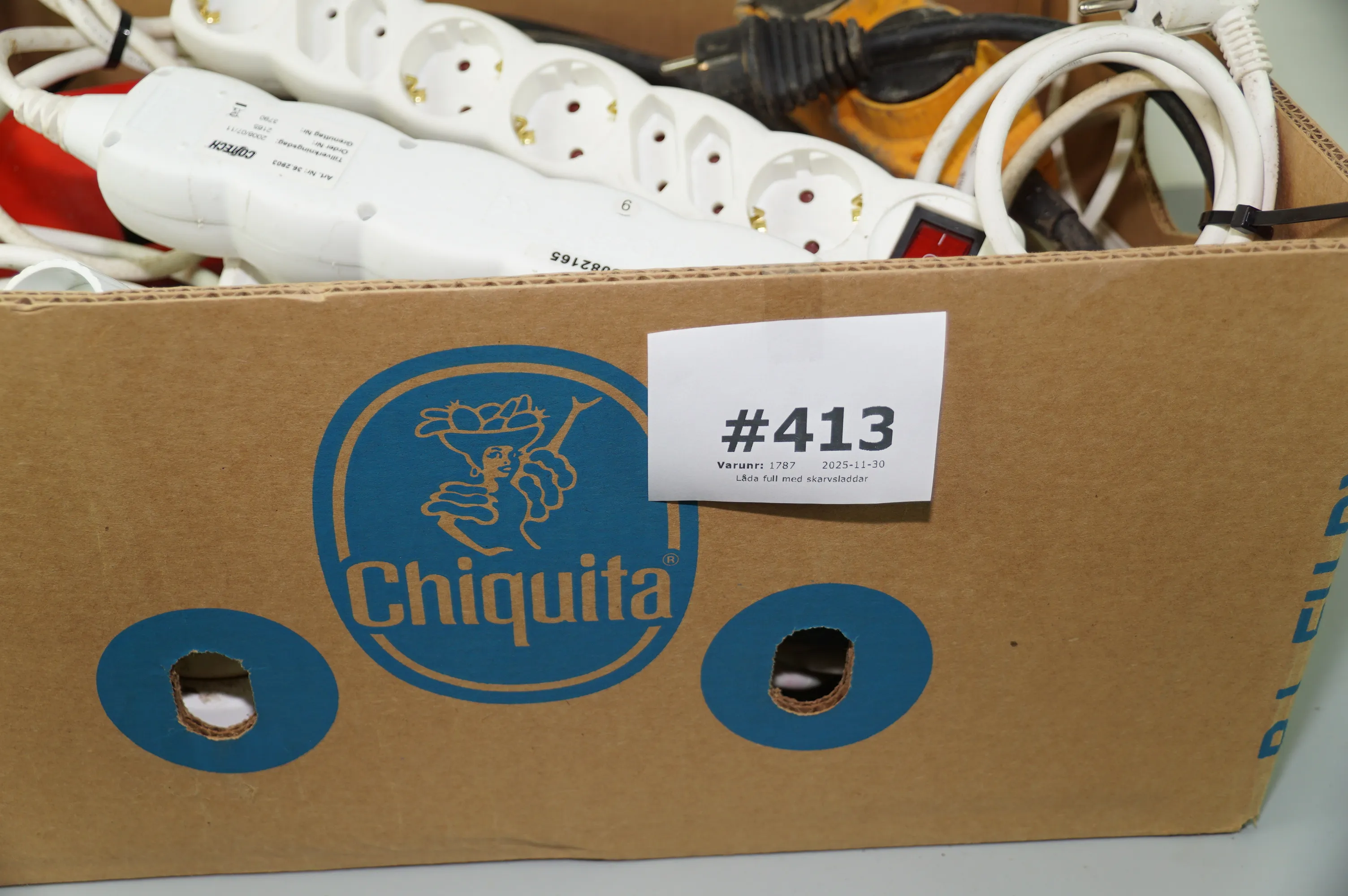 413. Låda full med skarvsladdar
