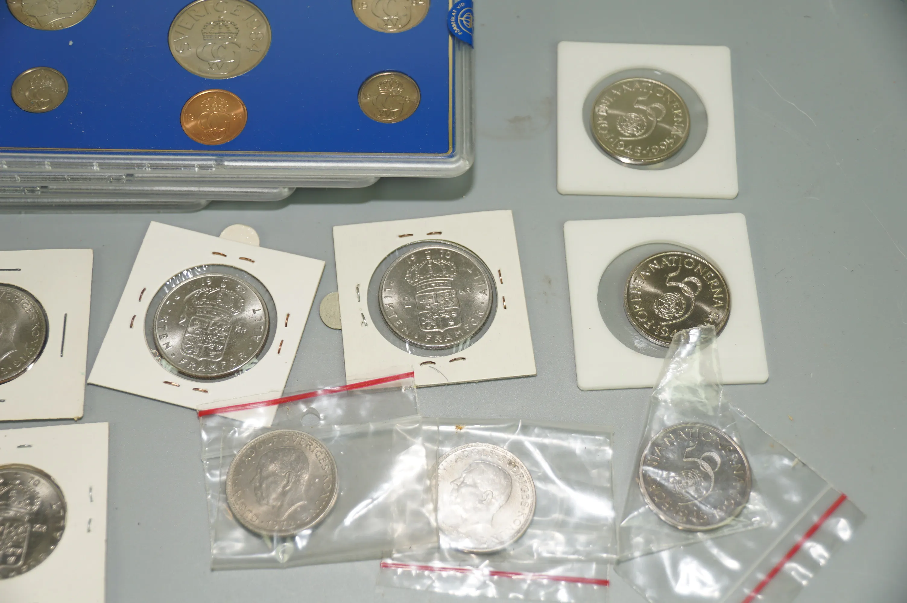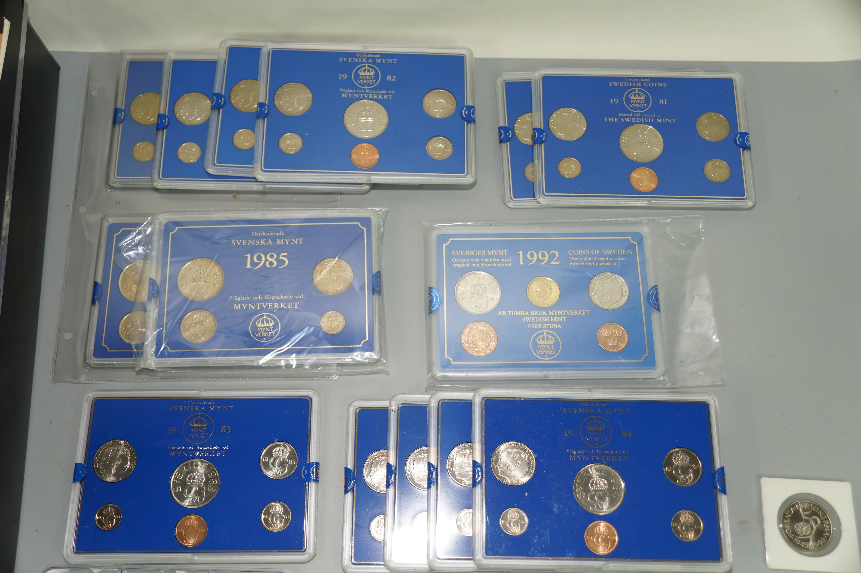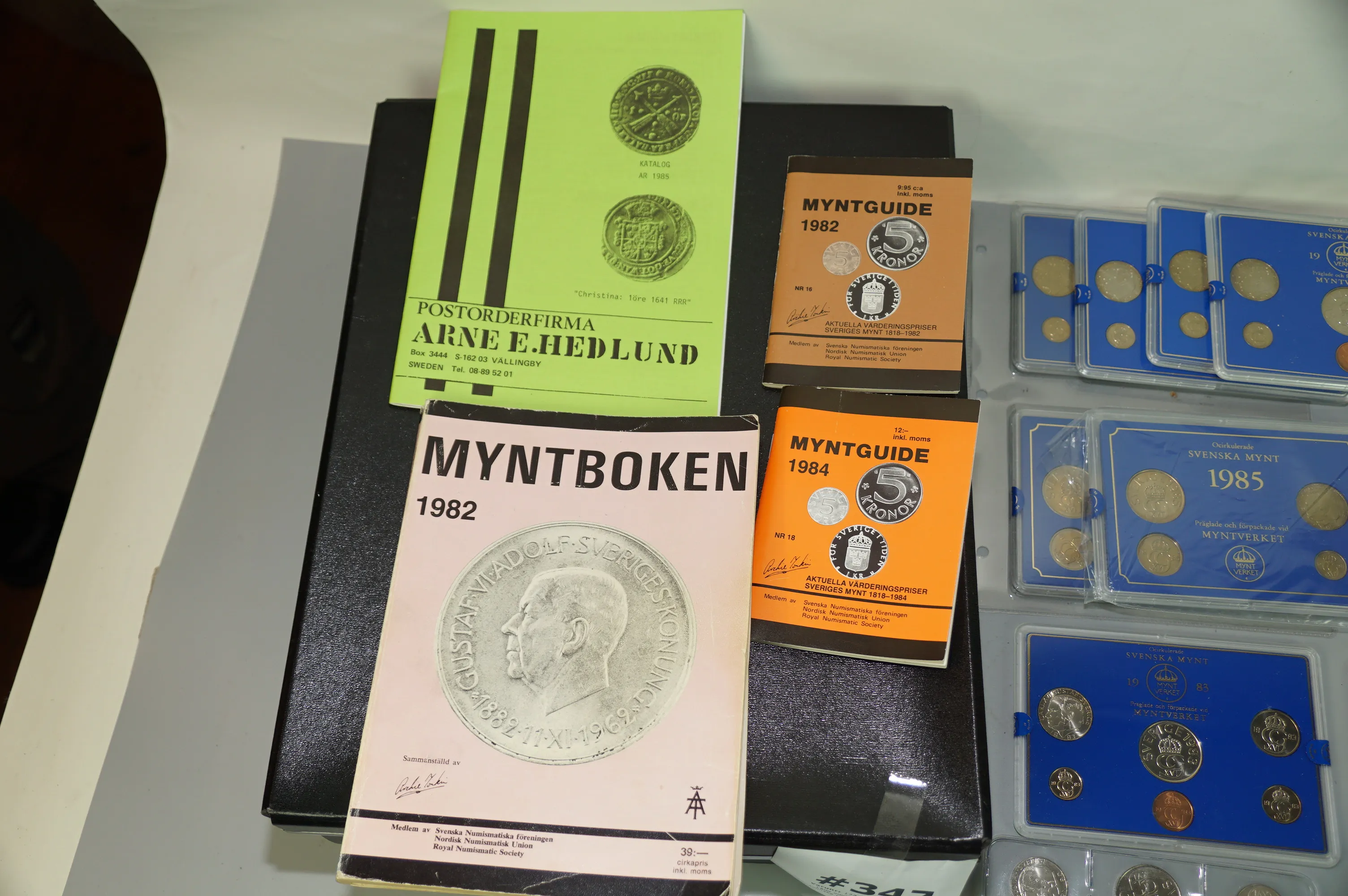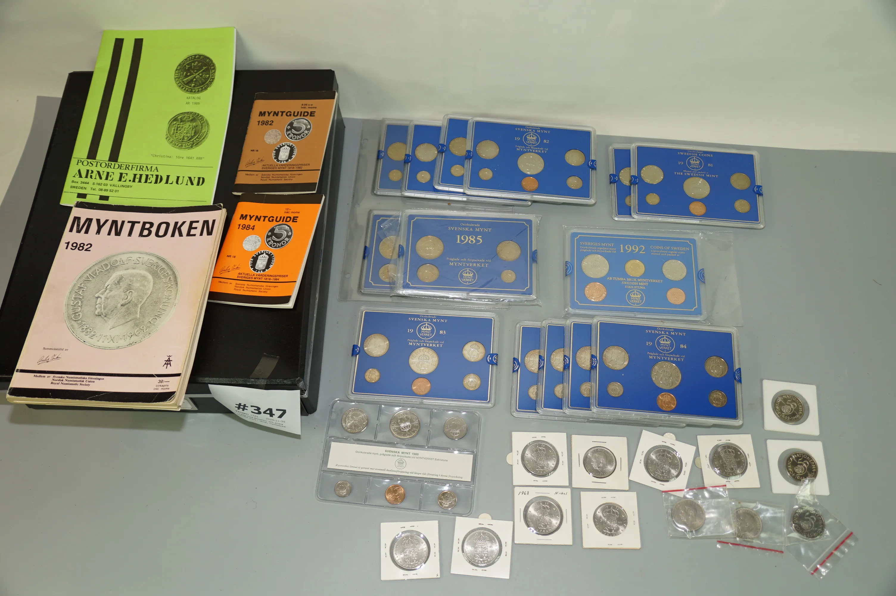 347. Låda med årssatser och andra svenska mynt i ramar, myntböcker