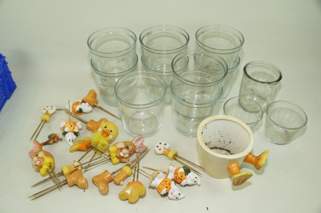 268. Låda med blomkrukor i glas och påskdekoration till blomkrukor