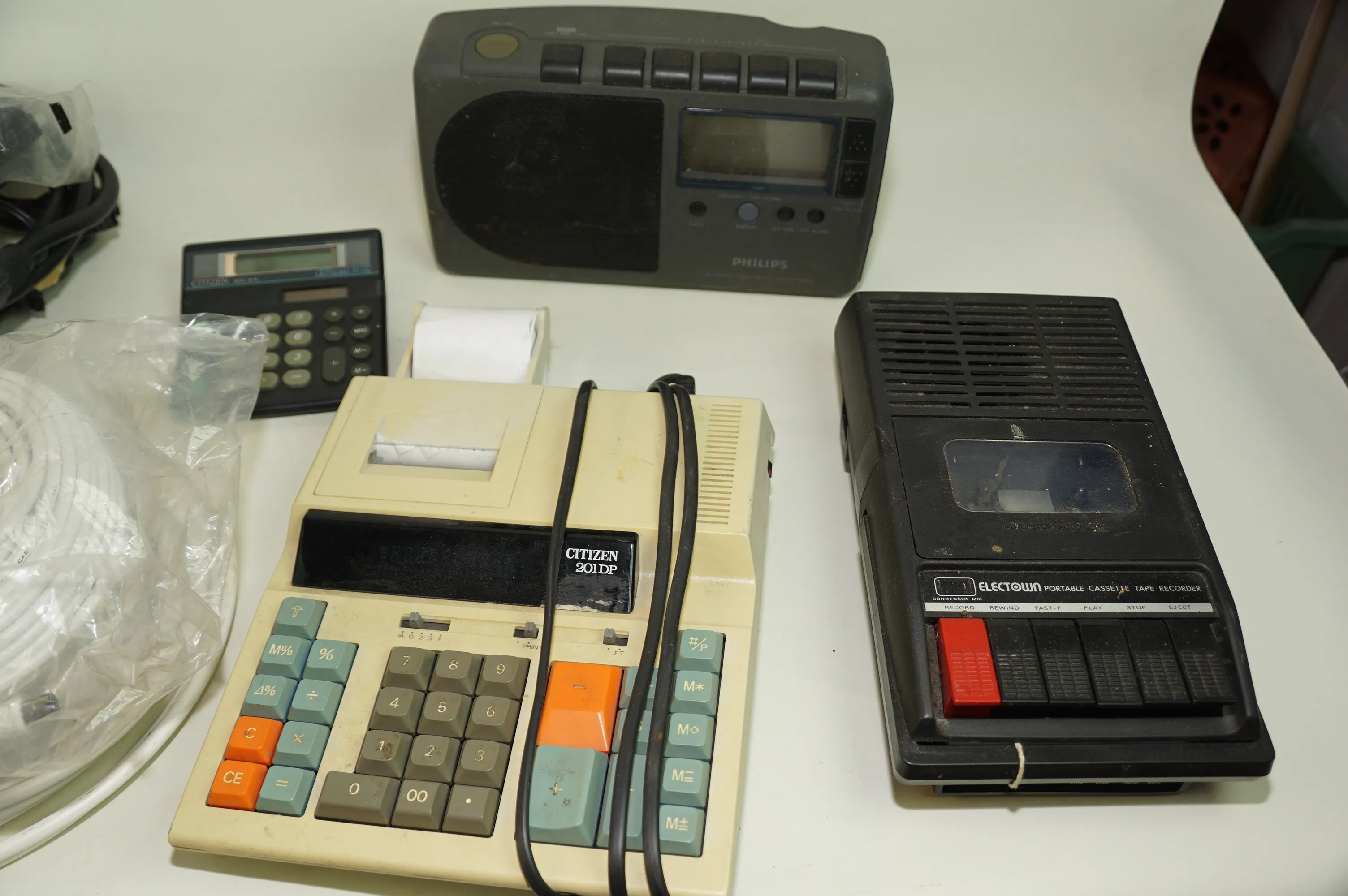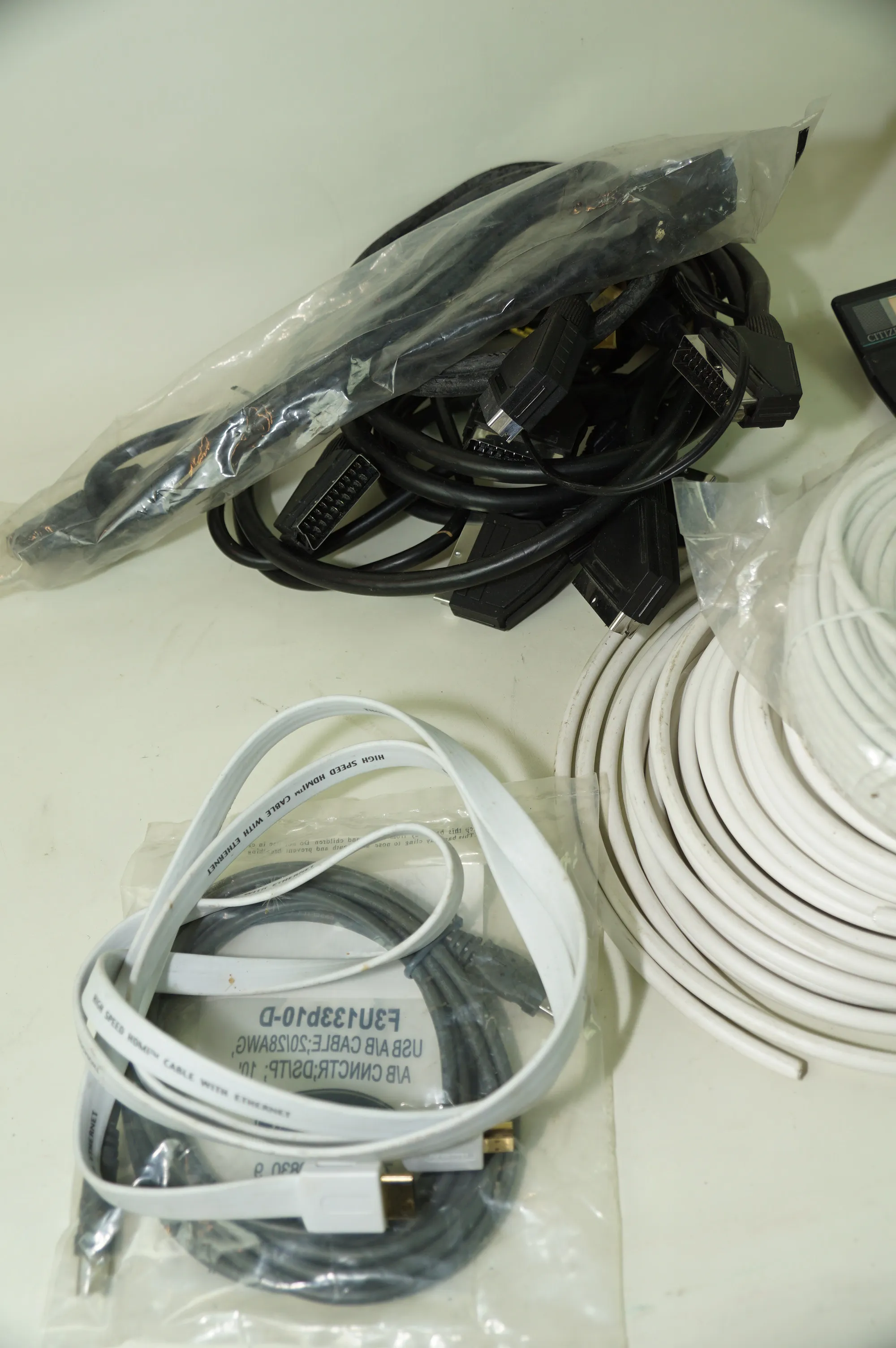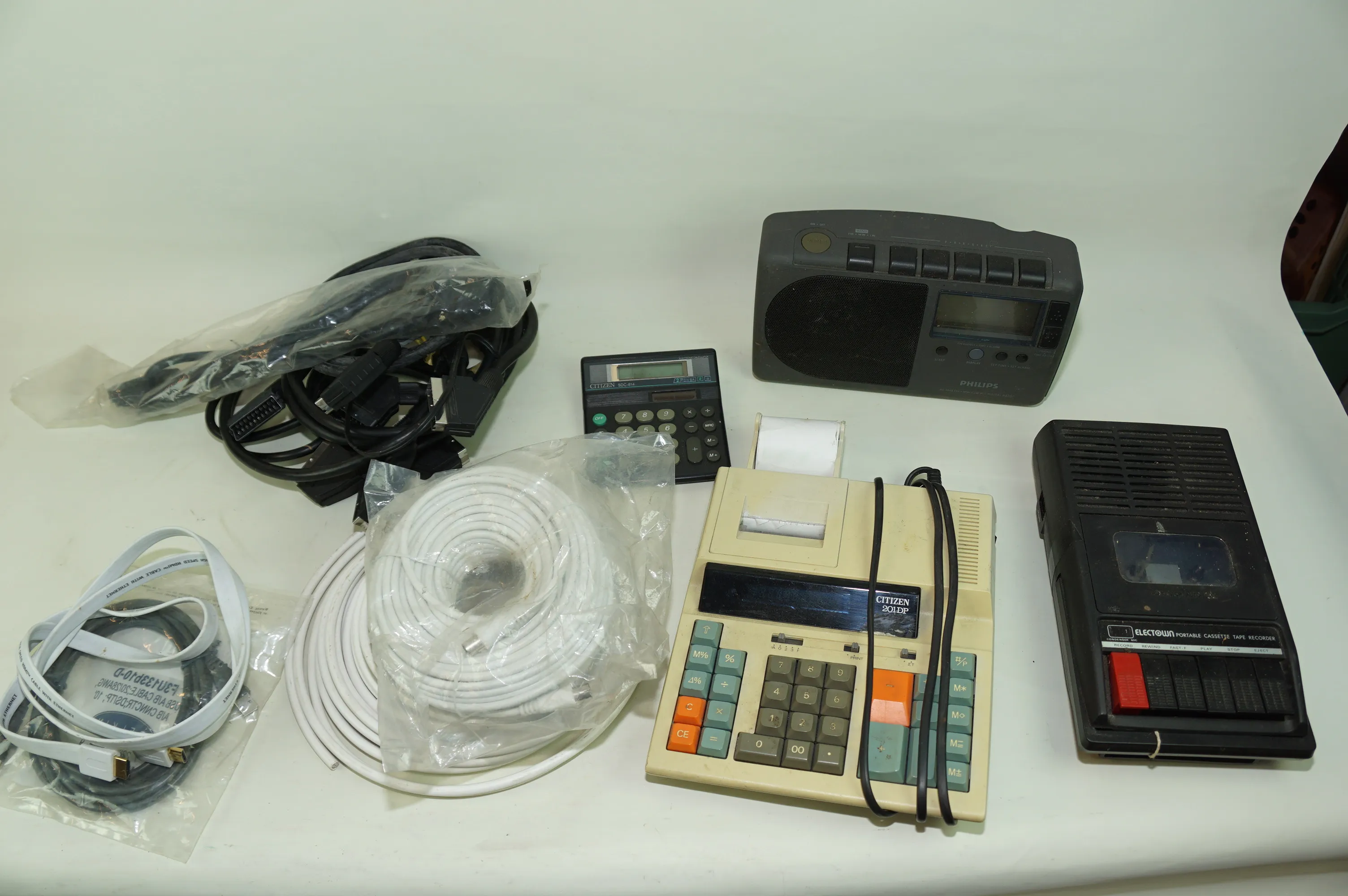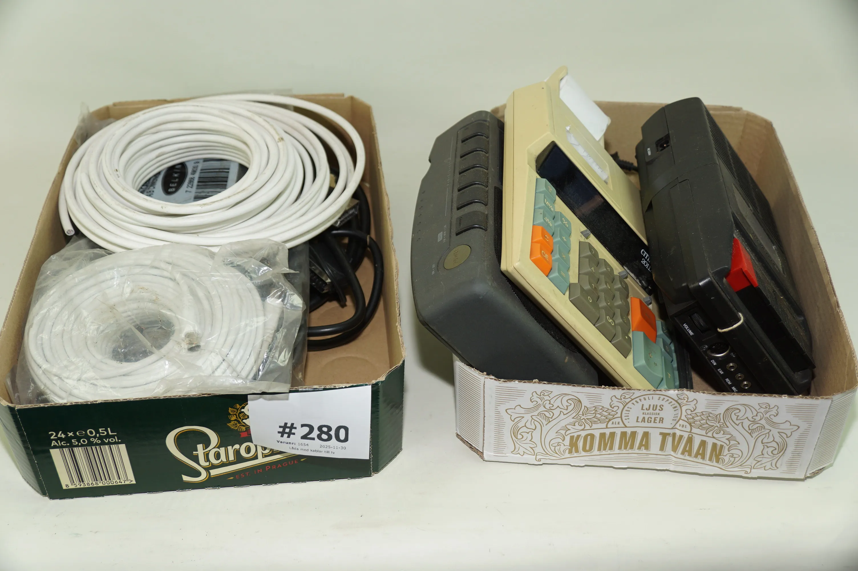 280. Låda med kablar till tv, radio, räknemaskin, bandare.