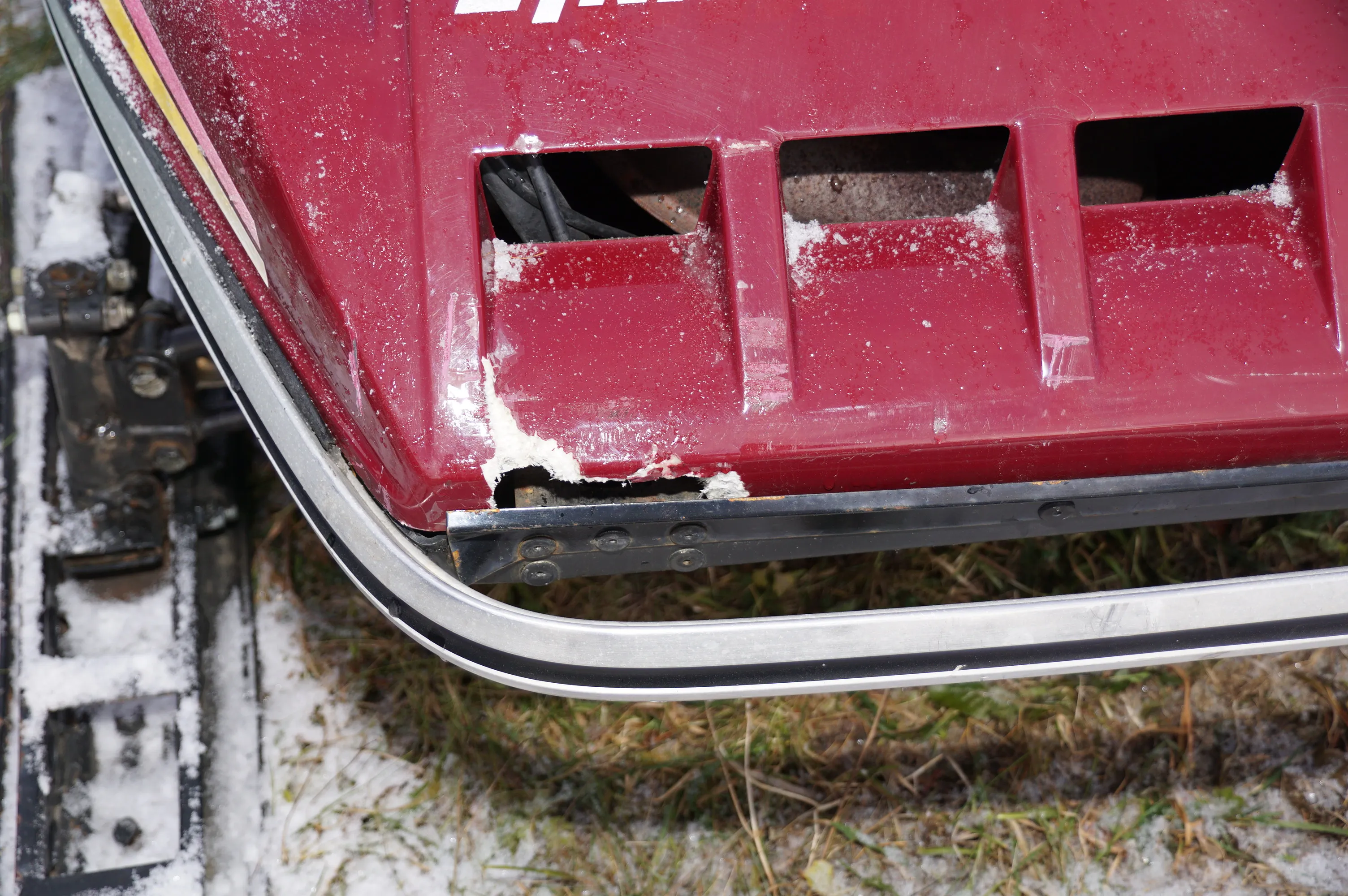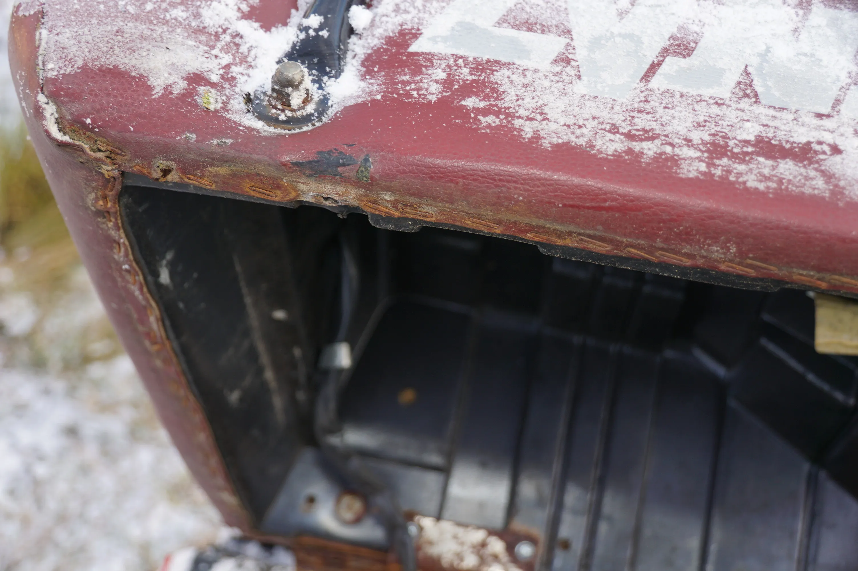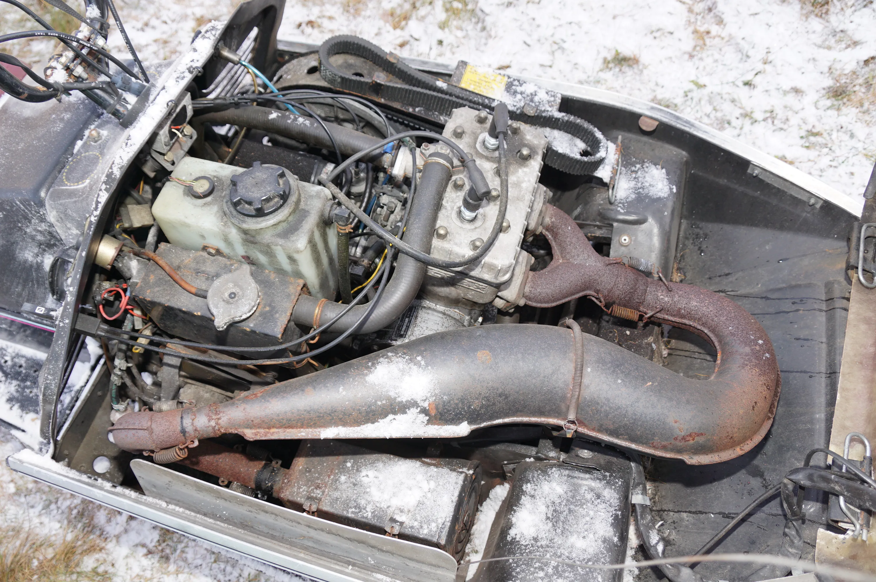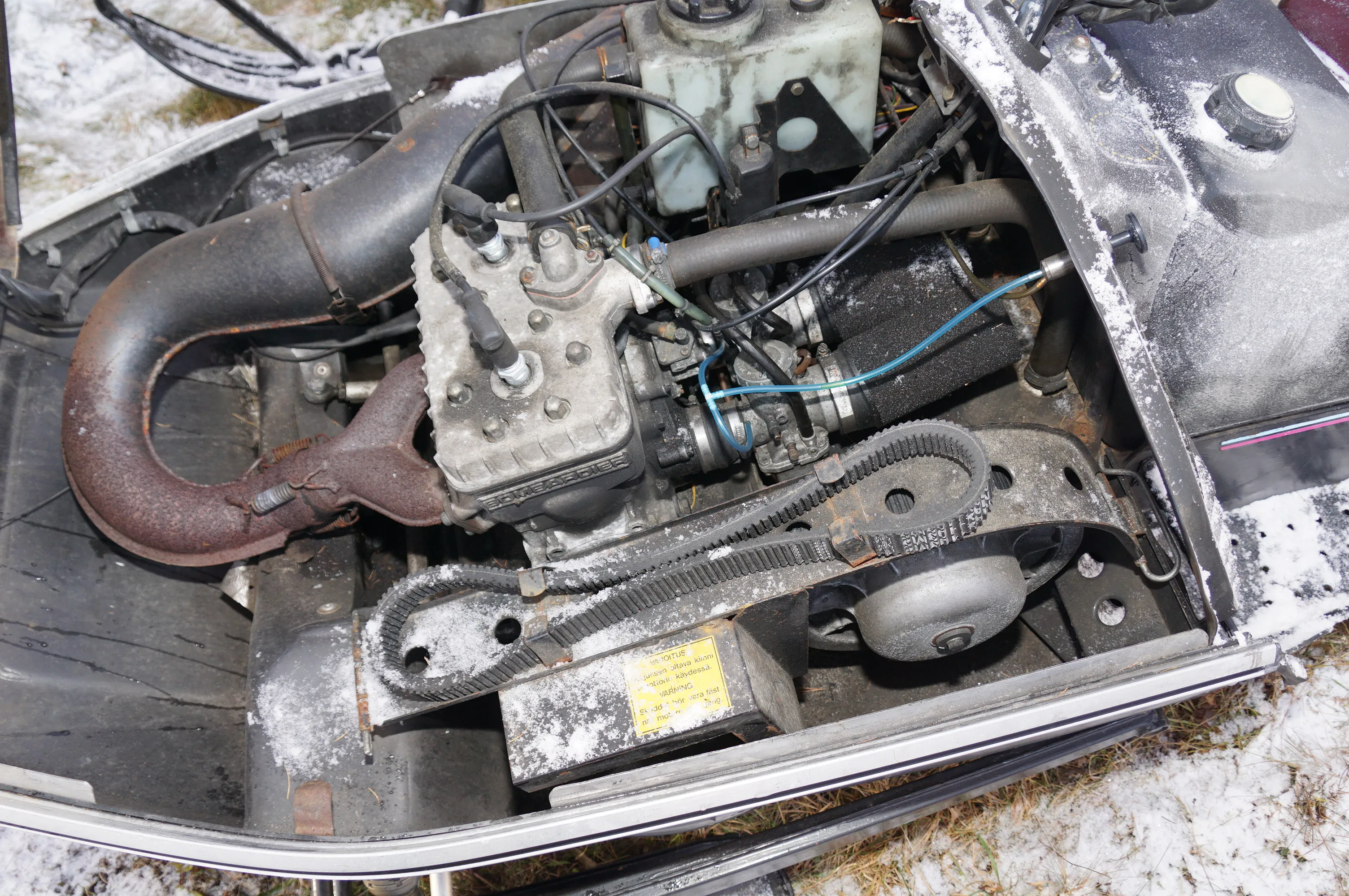 Ena fästet på huven är trasigt, vajerfästet som sitter i huven har lossnat. Rutan saknas. Låsningen till dynan är dålig/borta. Den startar.