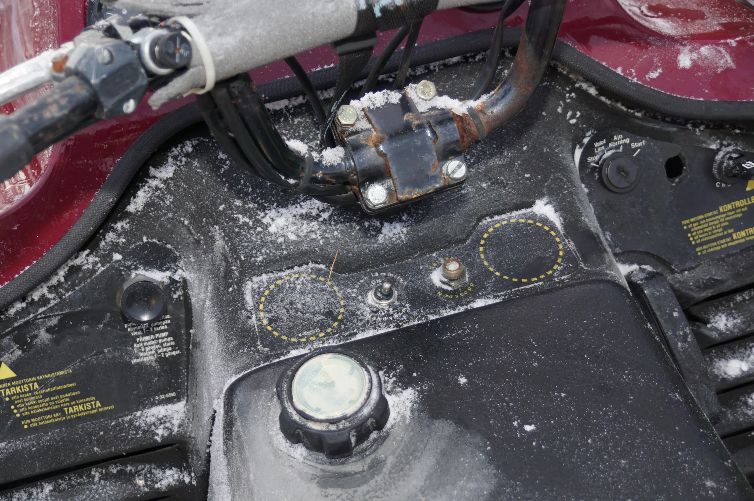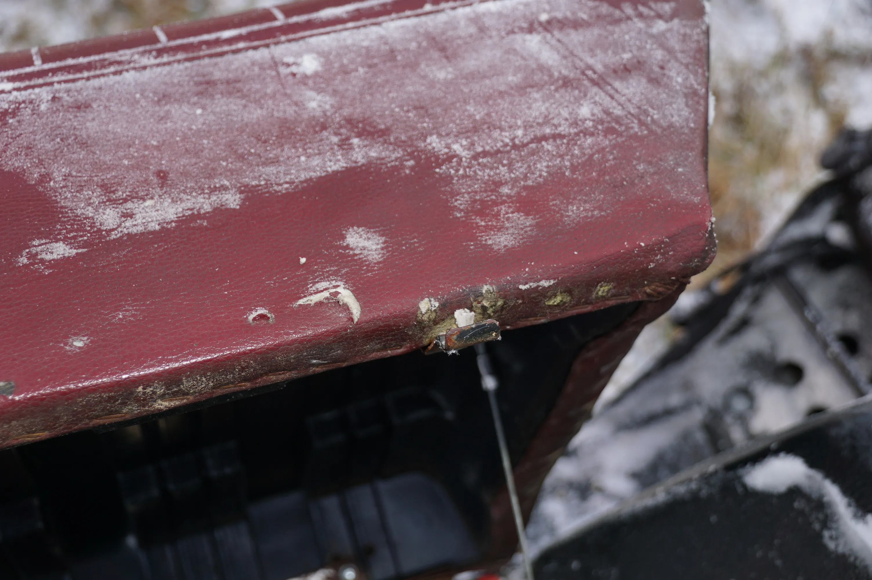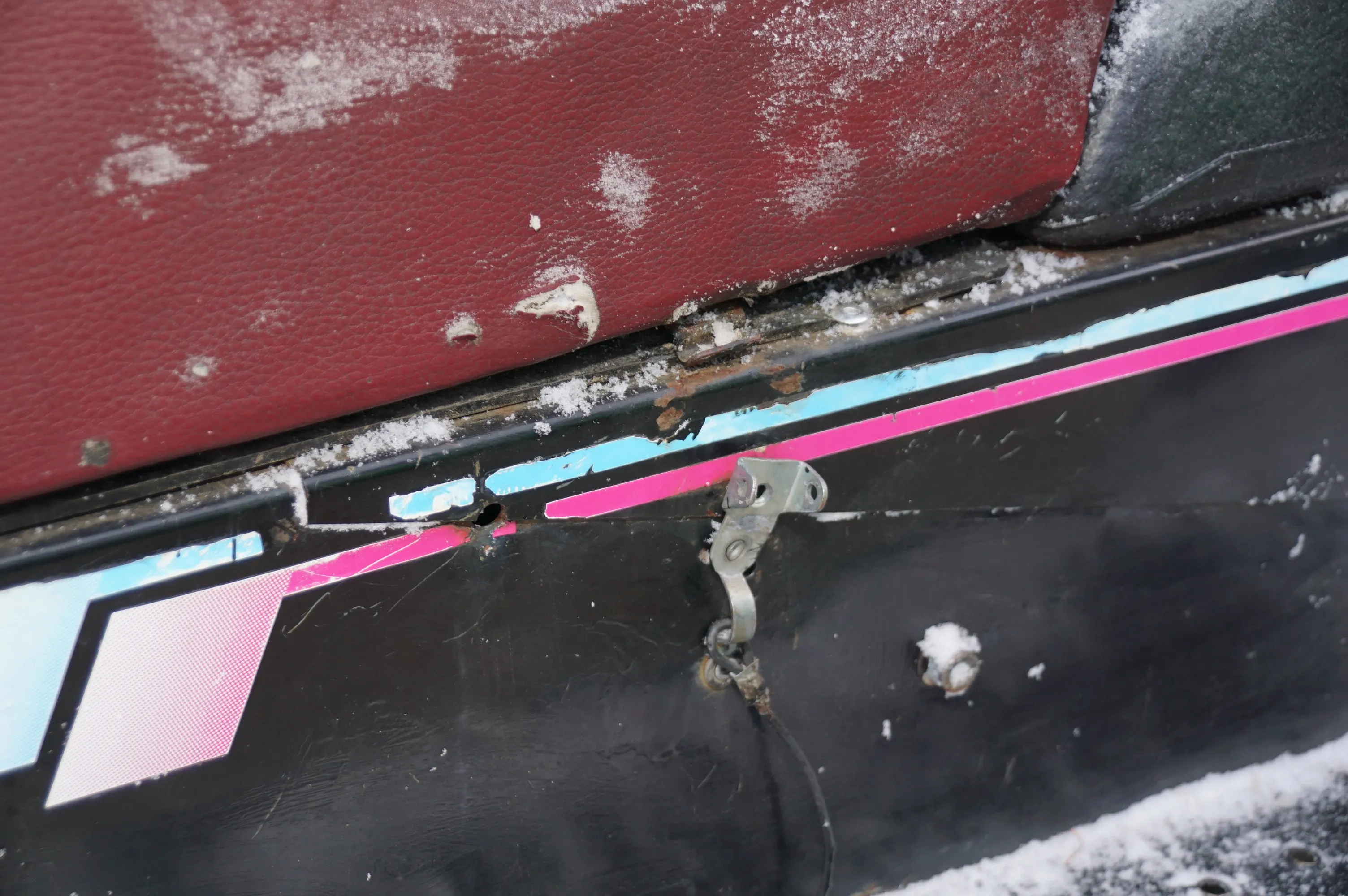 Ena fästet på huven är trasigt, vajerfästet som sitter i huven har lossnat. Rutan saknas. Låsningen till dynan är dålig/borta. Den startar.