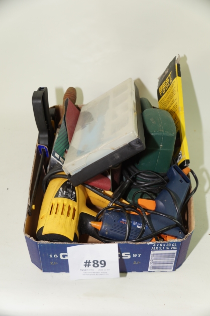 89. Låda med blandade verktyg varmluftspistol slip popnit mm