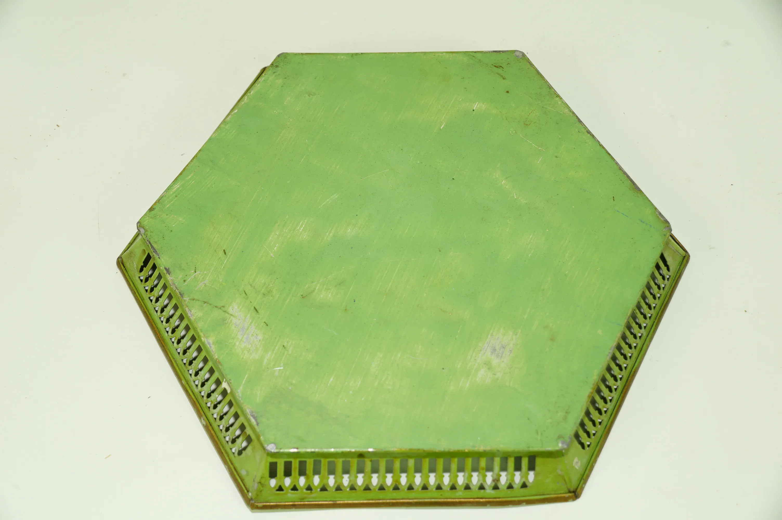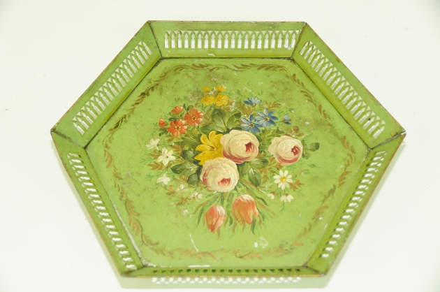 144. Plåtbricka med genombruten kant målad blommor på grön bakgrund