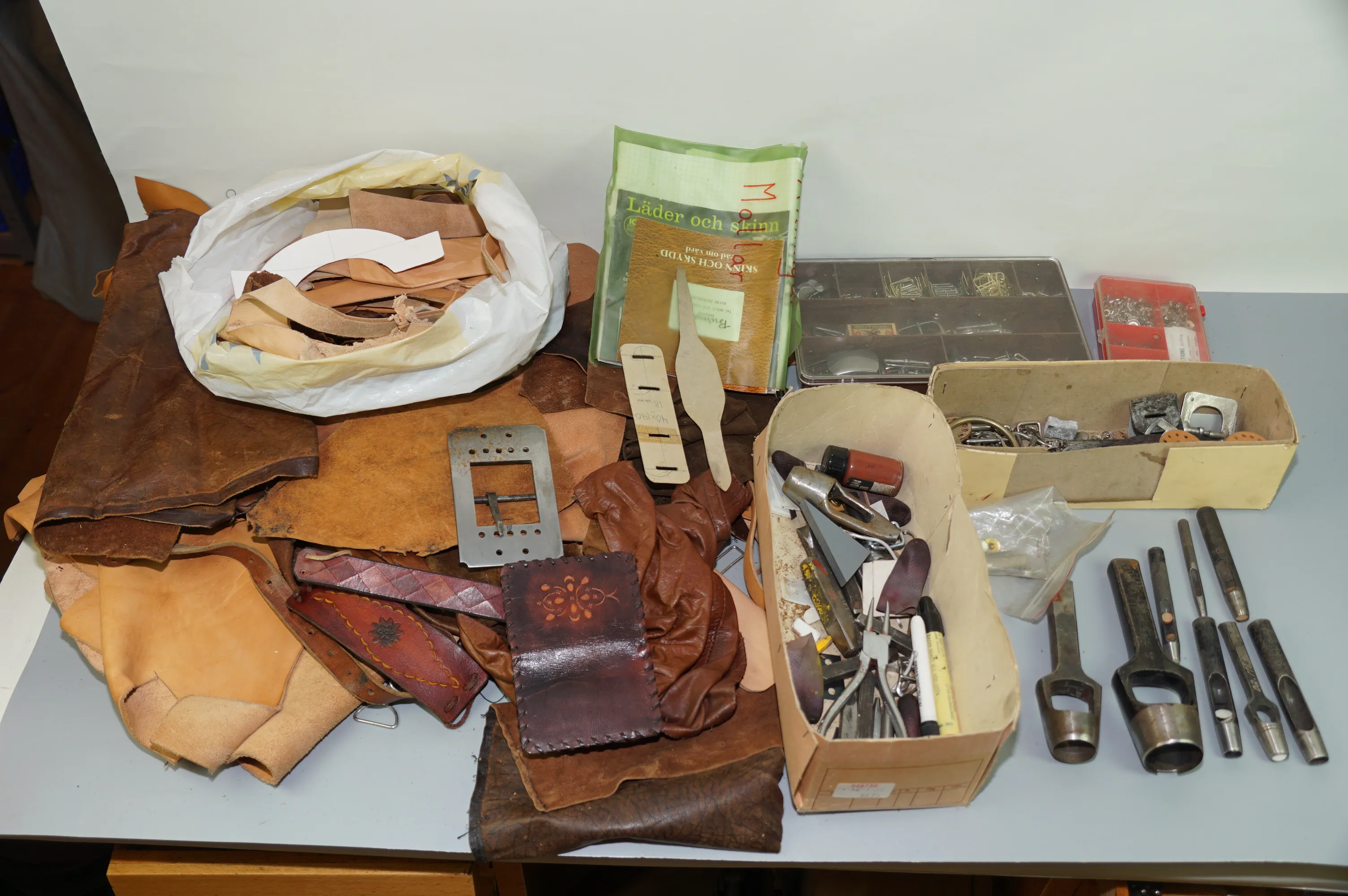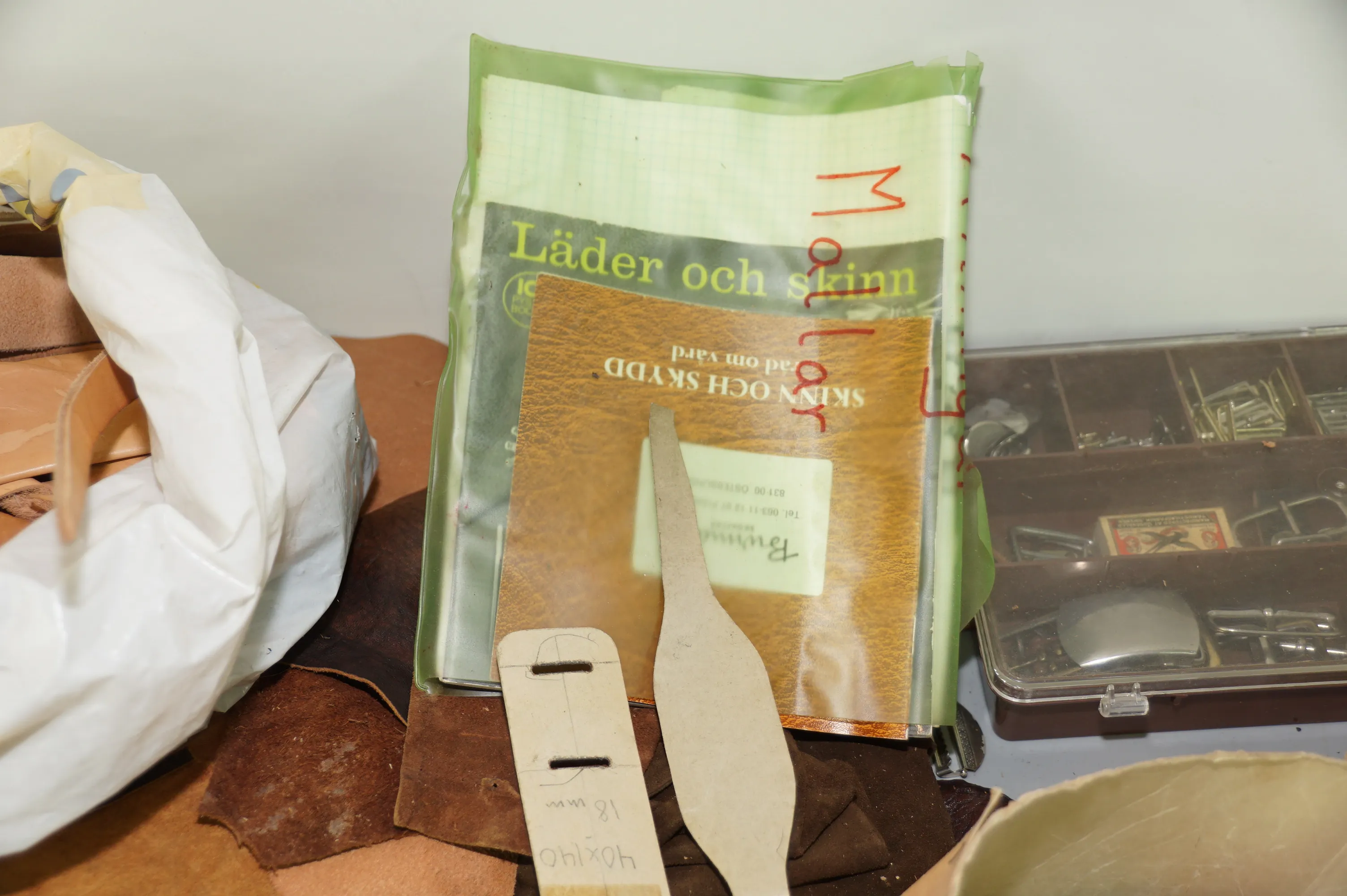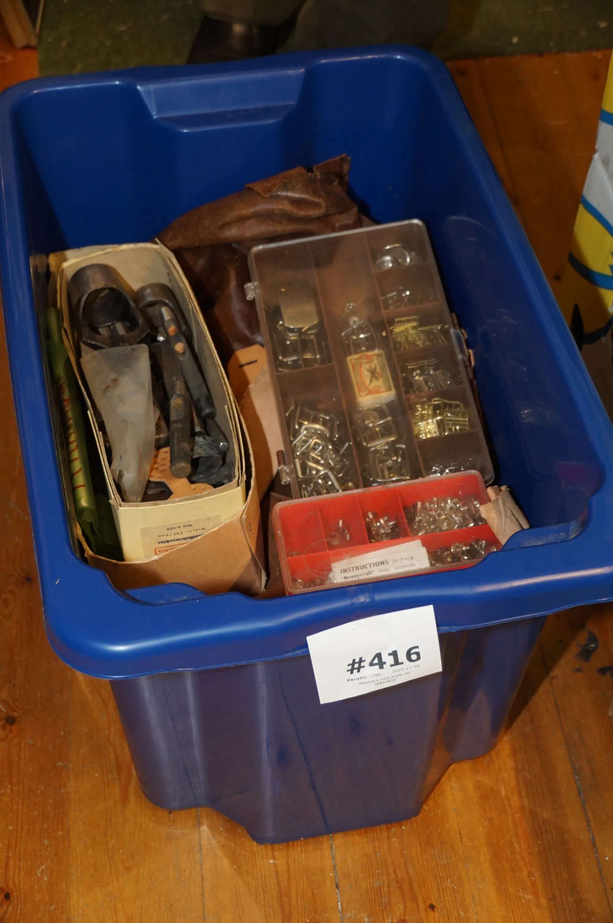 416. Plastback med prylar för läderslöjd