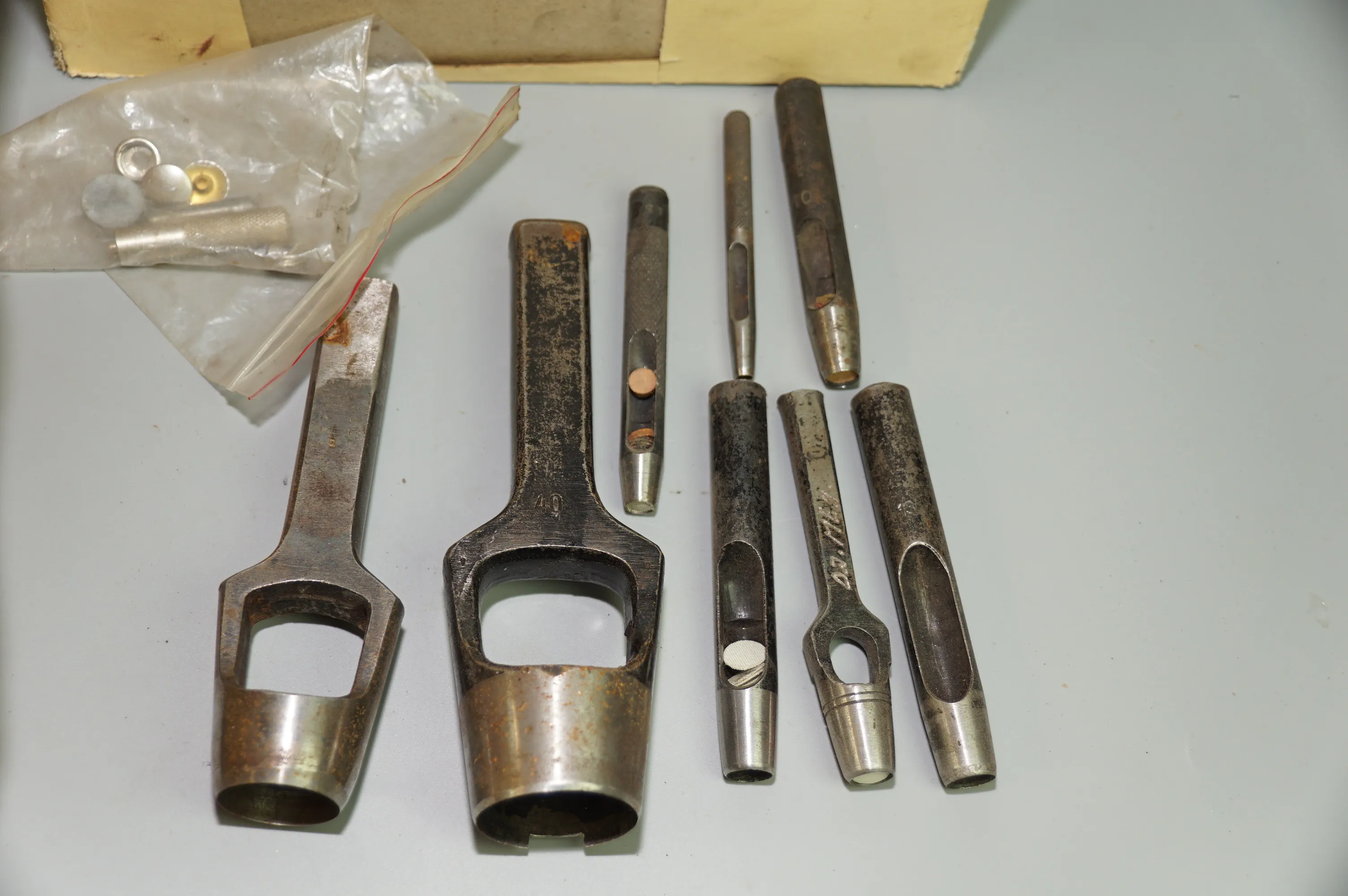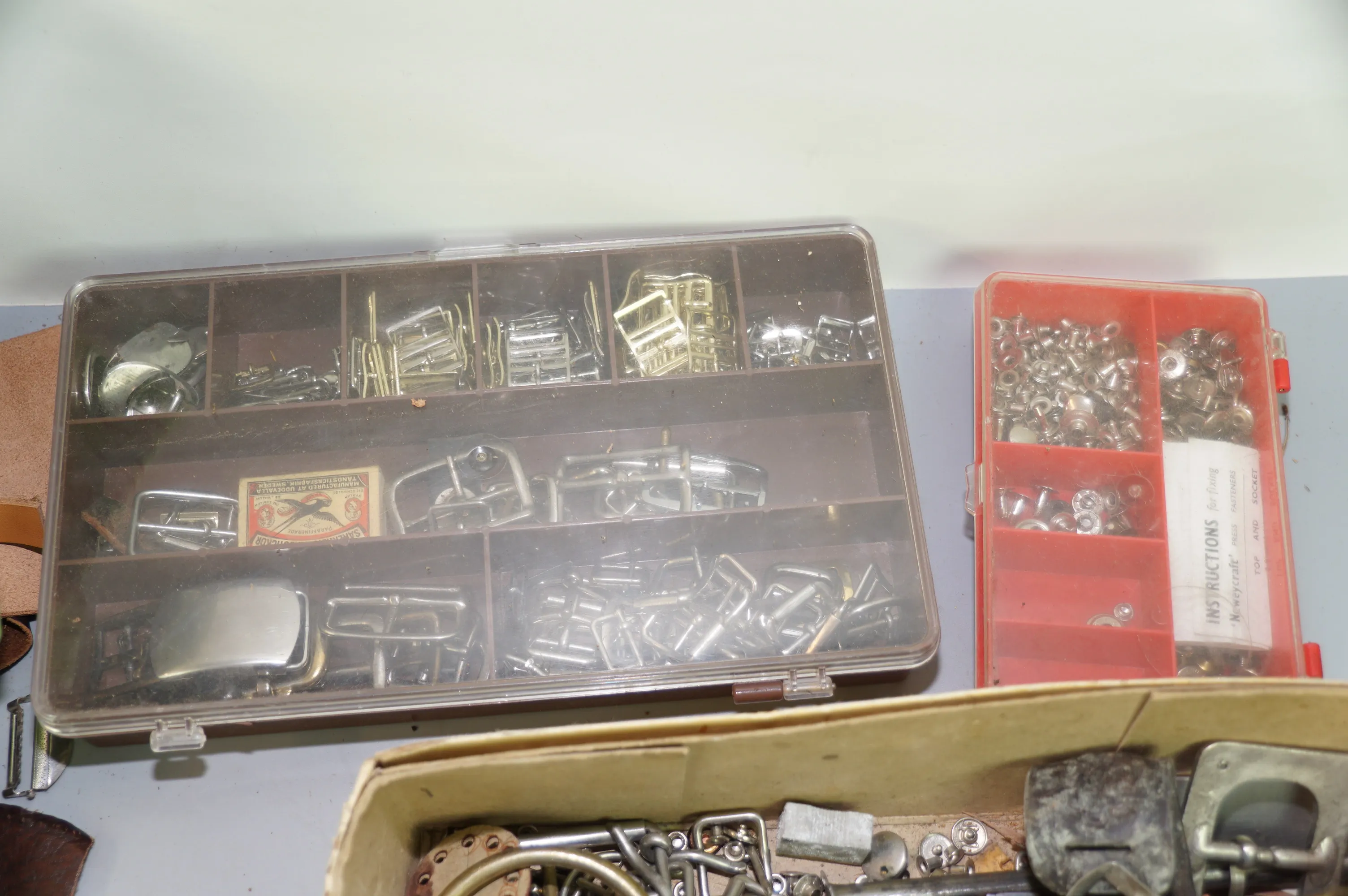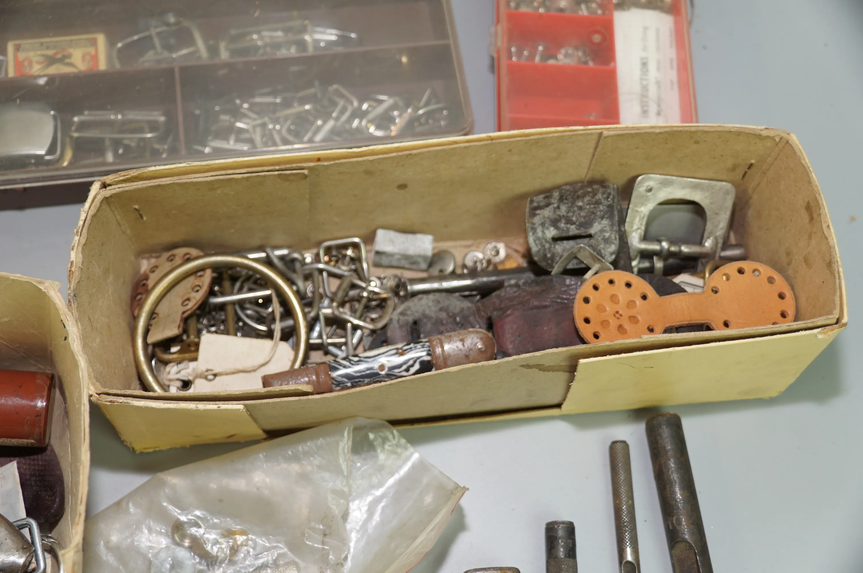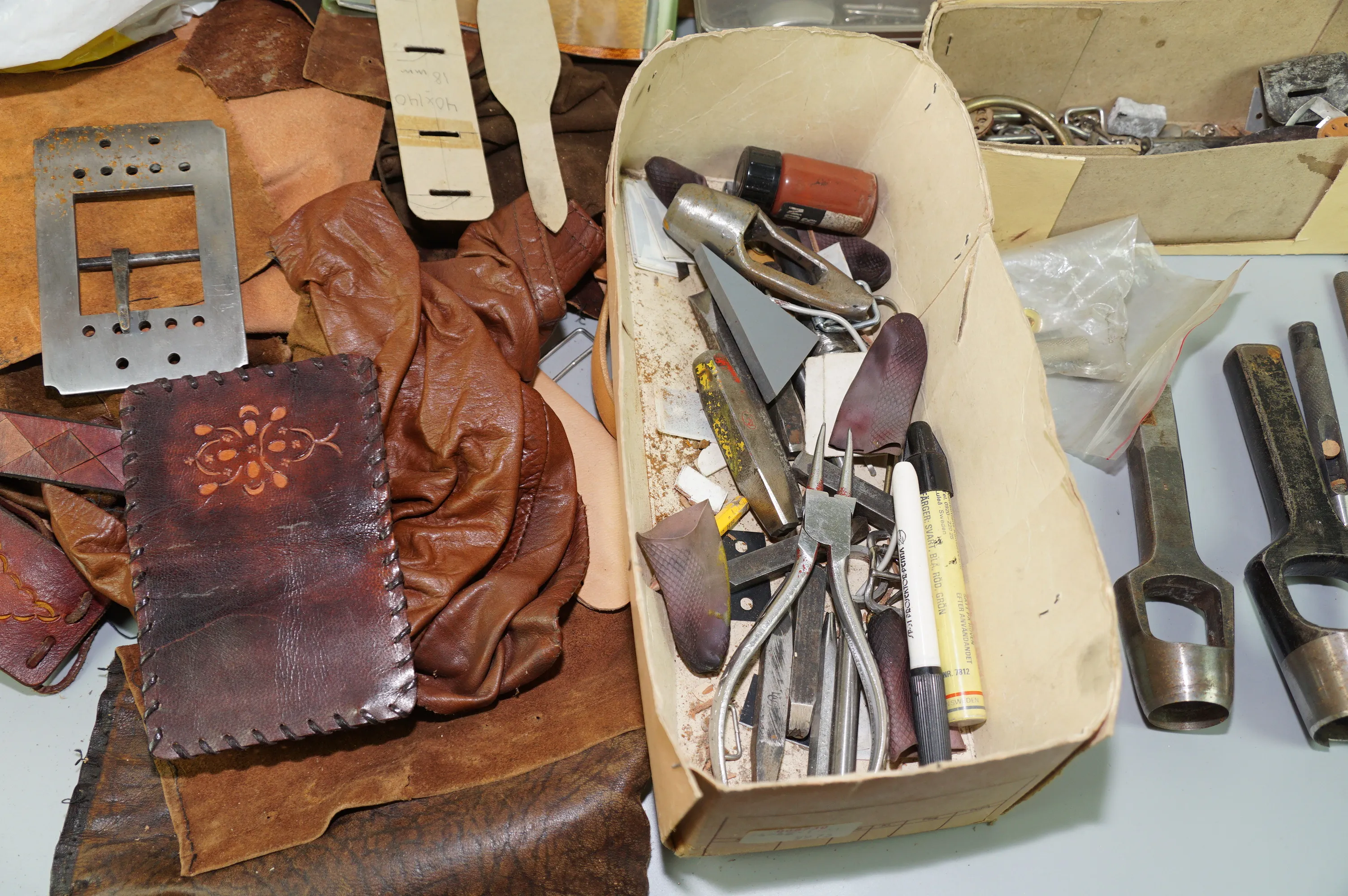 416. Plastback med prylar för läderslöjd