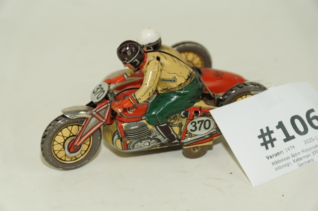 106. Plåtleksak Äldre Motorcykel med sidovagn, Kellerman 370 Tourist Germany