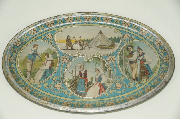 65. Serveringsbricka oval med flera landskapsdräkter, littograferad plåt